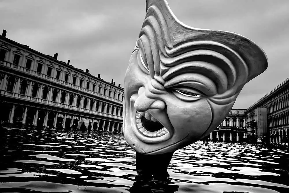 I met Gualtiero dell’Osto, a great artist who makes Venetian masks and a socially-committed man, by absolute chance when walking a Venetian calle. His creation the “urlo muto” represents the unheeded shout of the Venetians. In this image, the urlo muto looks horrified while looking at the rising waters in piazza San Marco.