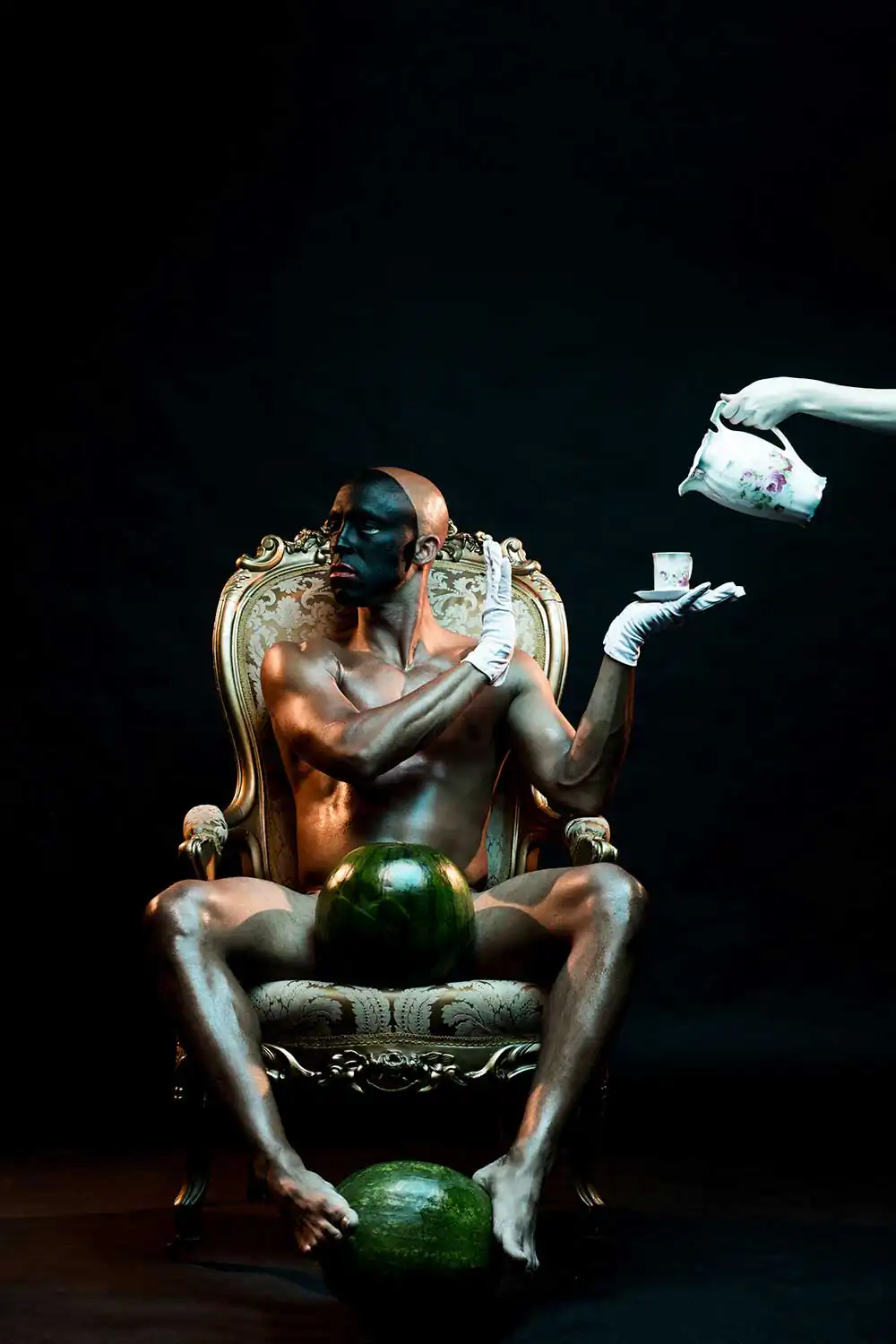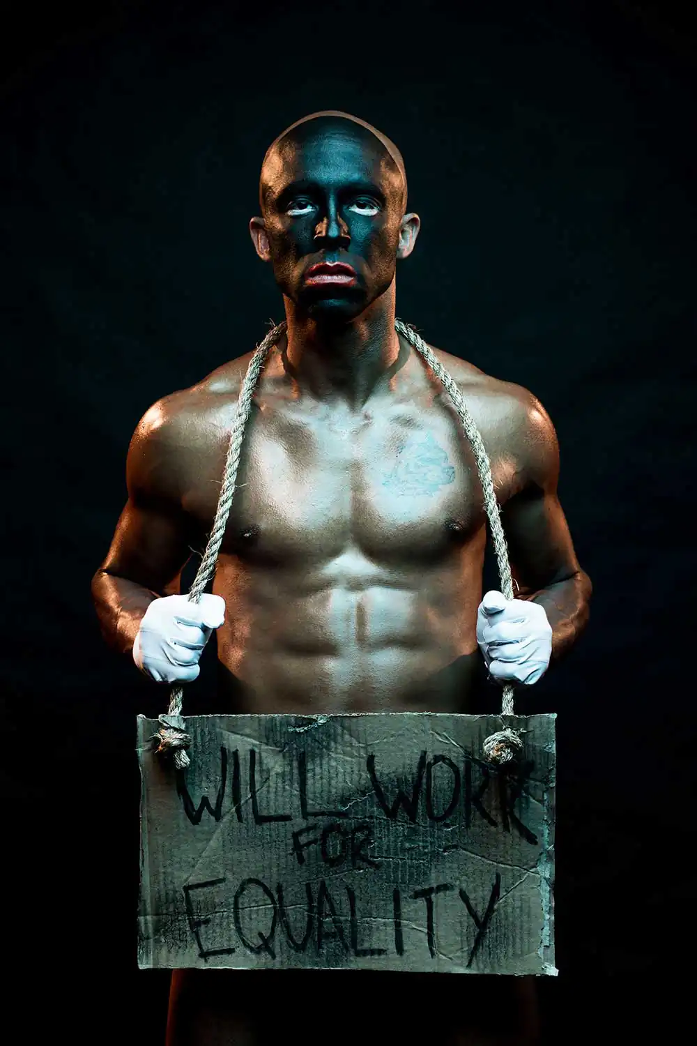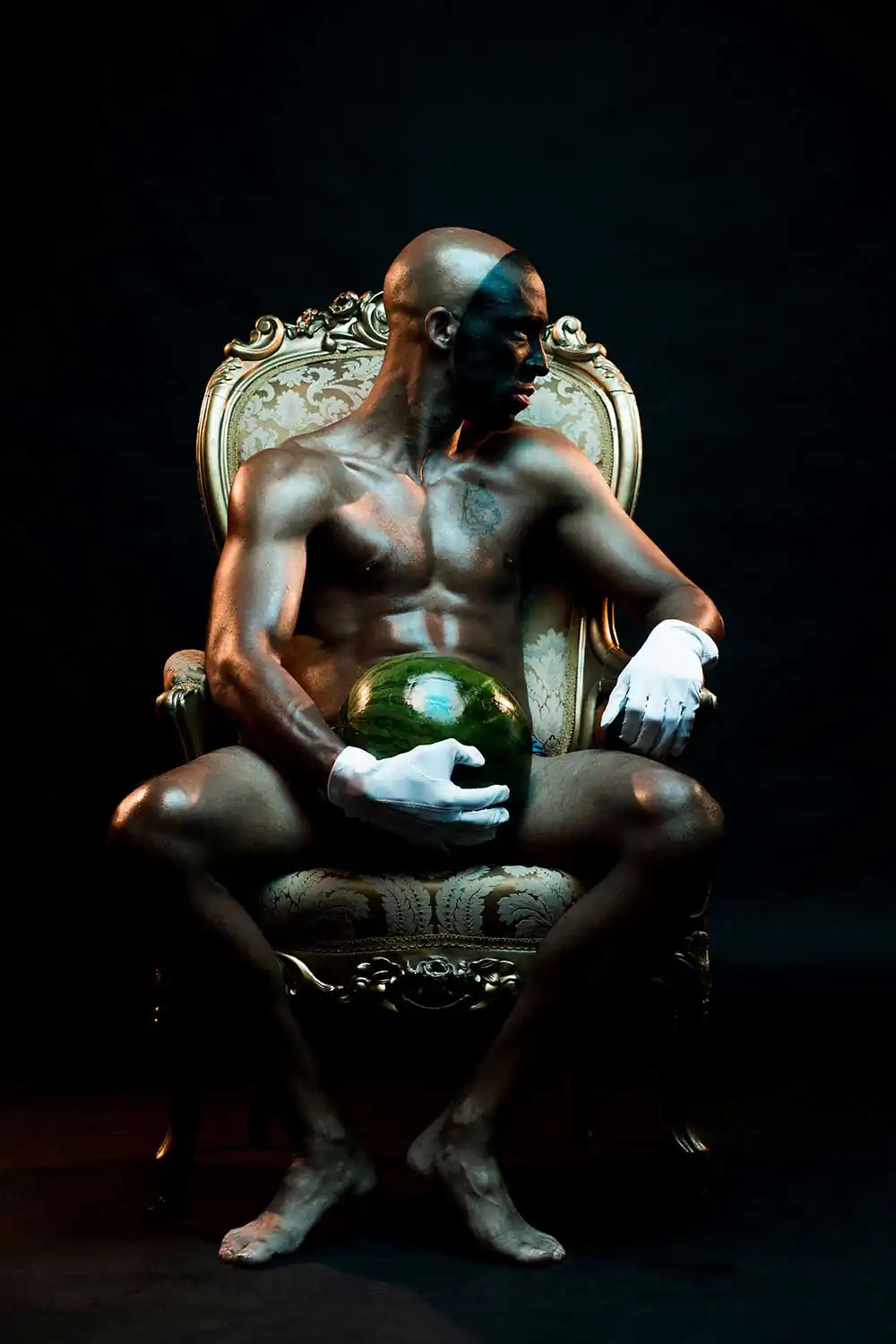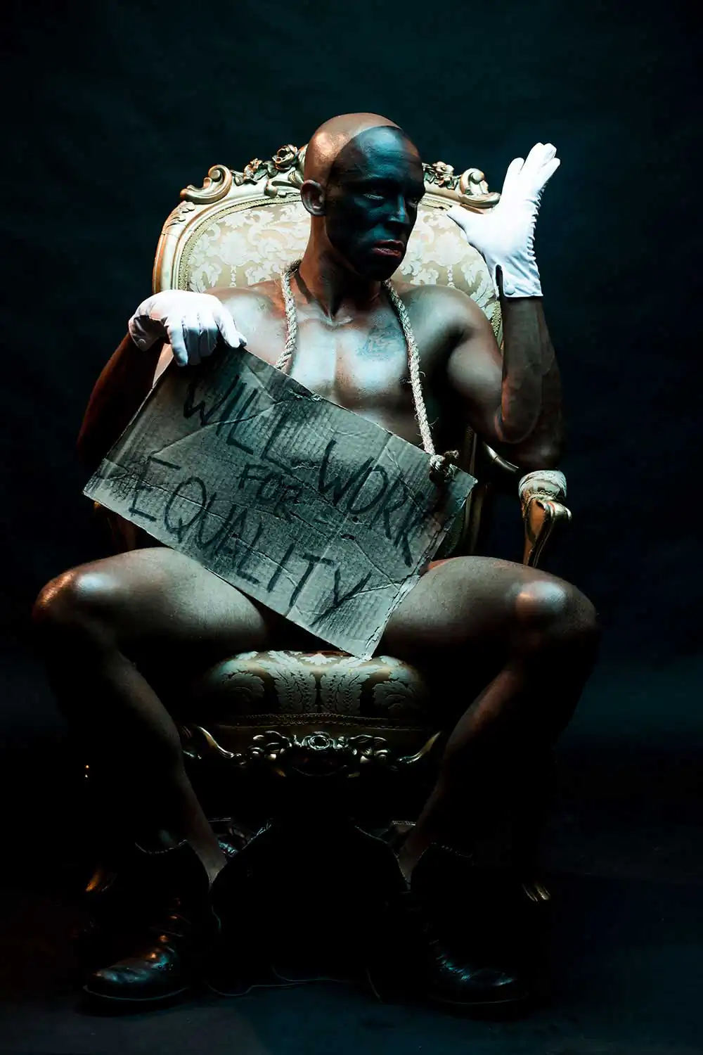 David Bianchi’s vision was to illuminate the disparity of black and minority presence in modern entertainment and media. The series begins stoic using elements of the white subservient gloves, (to indicate the role of the black person in elite white culture) against the nude form of a black man pained in blackface to make an oxymoronic image of himself. The use of the homeless sign will work for equality is a metaphor for the will to lose oneself in order to be treated fairly. As the series evolves the man uses stereotypes to re-enforce his perceived status in society, hence the glorification of the watermelon while sitting in a gold-plated throne.