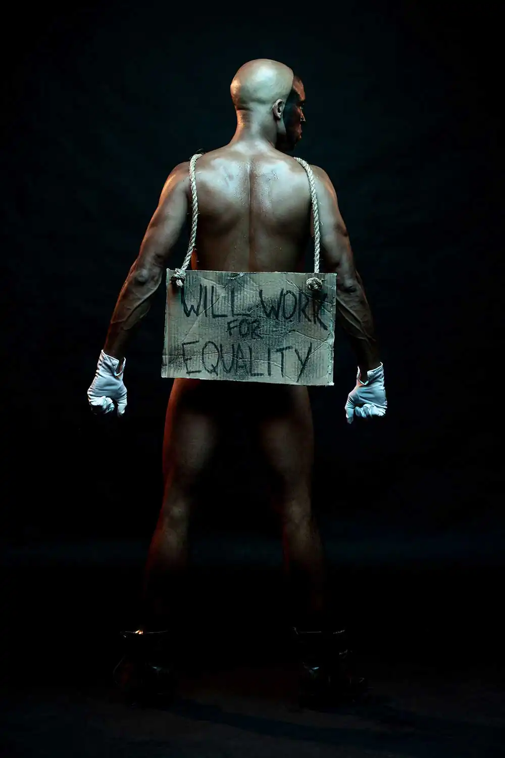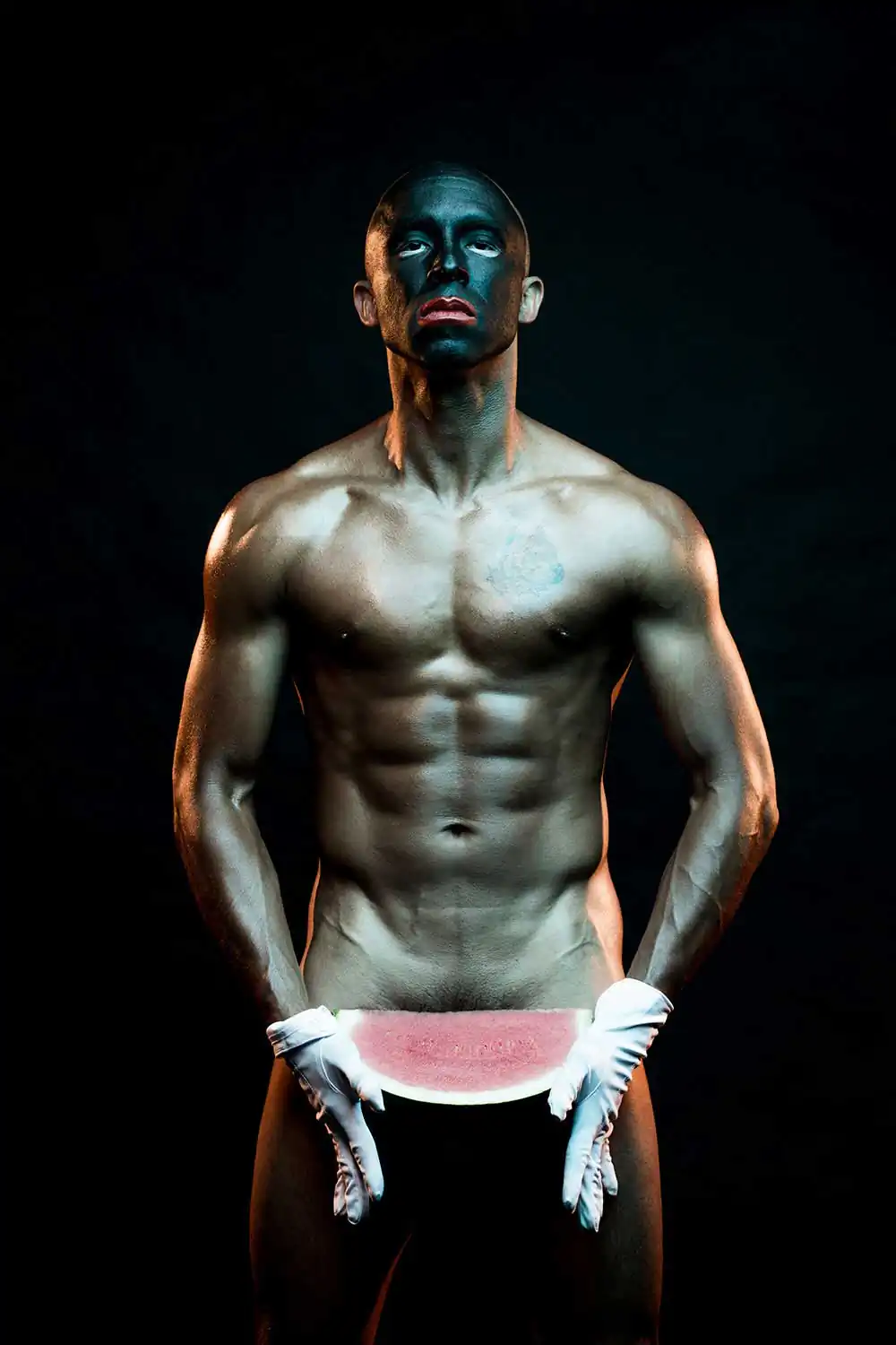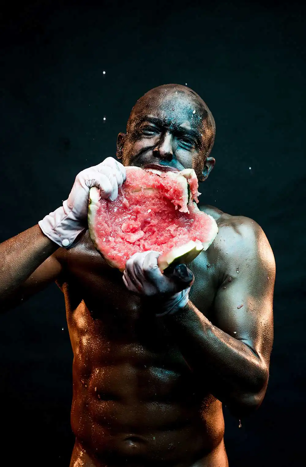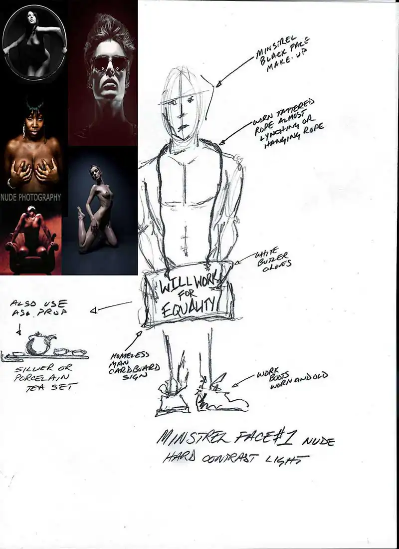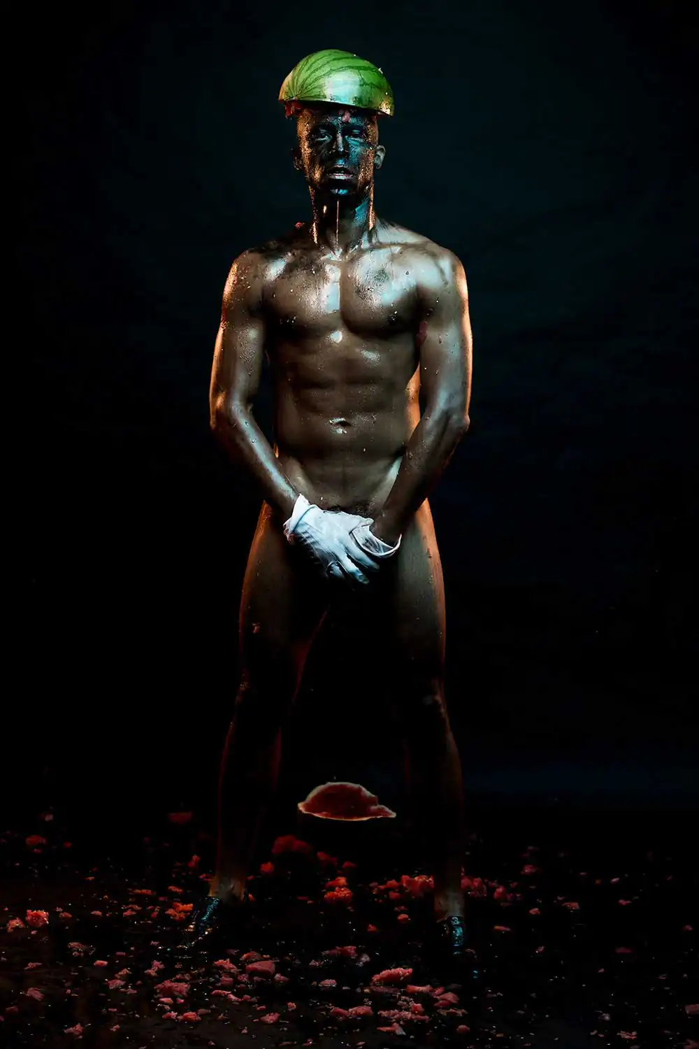 David Bianchi’s vision was to illuminate the disparity of black and minority presence in modern entertainment and media. The series begins stoic using elements of the white subservient gloves, (to indicate the role of the black person in elite white culture) against the nude form of a black man pained in blackface to make an oxymoronic image of himself. The use of the homeless sign will work for equality is a metaphor for the will to lose oneself in order to be treated fairly. As the series evolves the man uses stereotypes to re-enforce his perceived status in society, hence the glorification of the watermelon while sitting in a gold-plated throne.