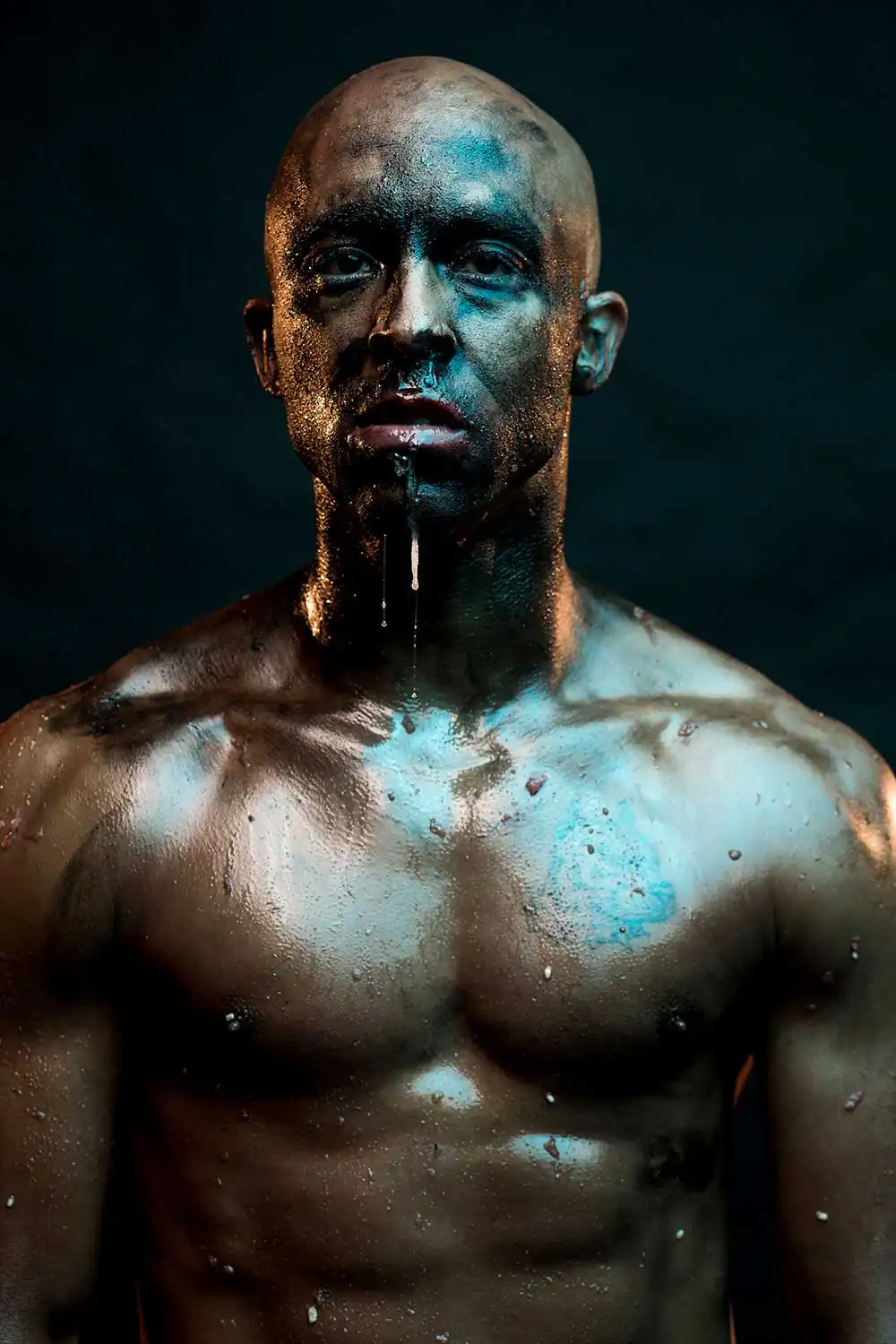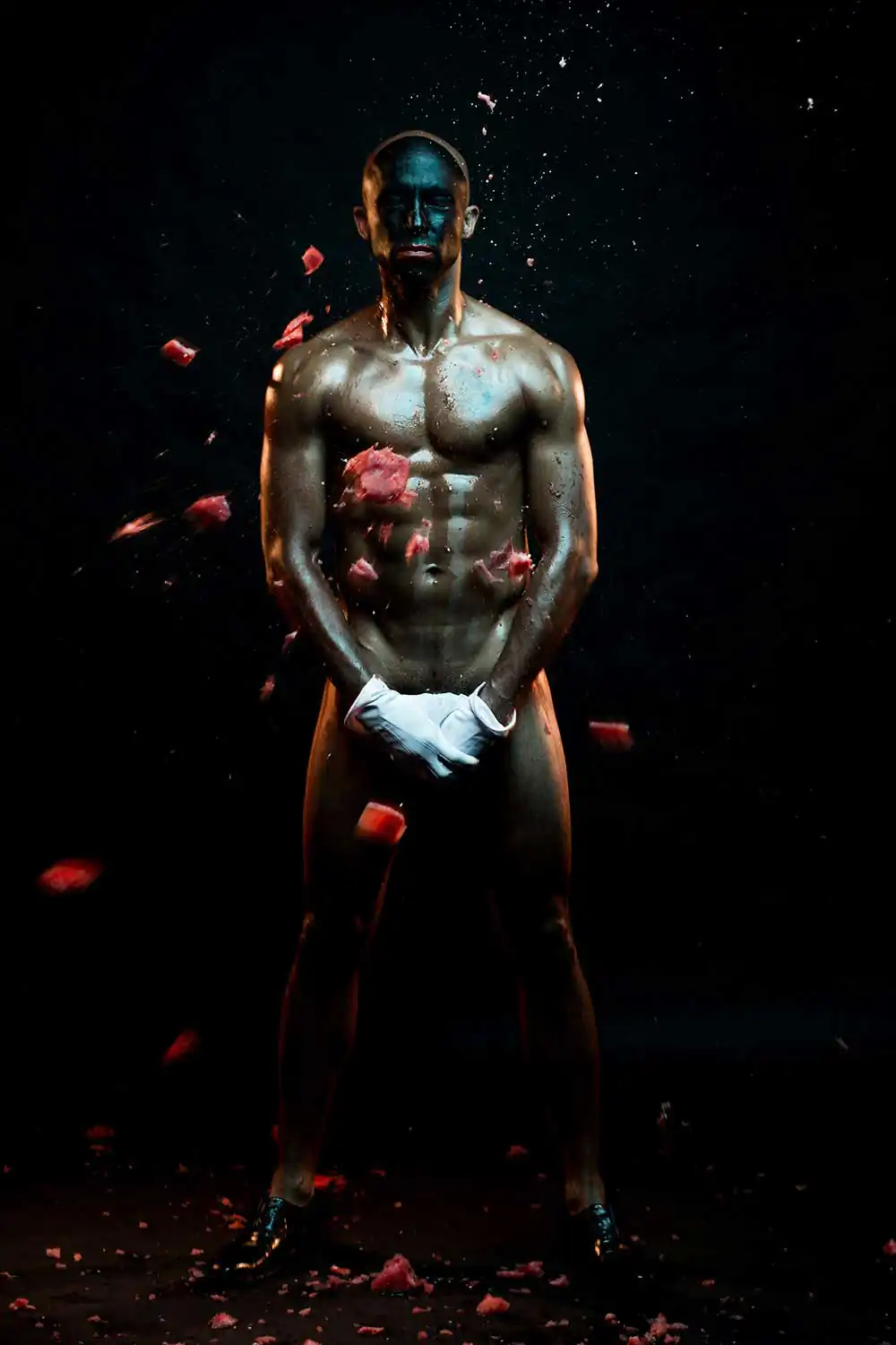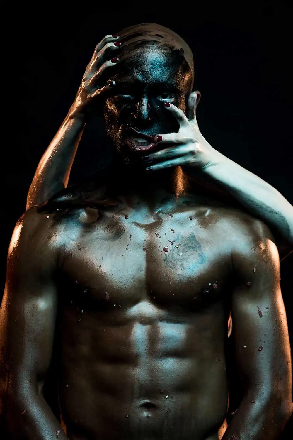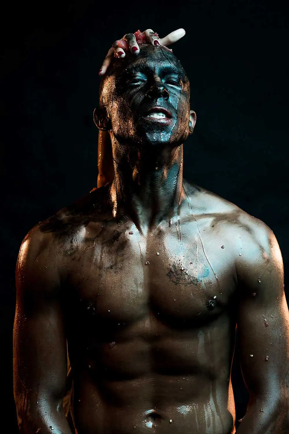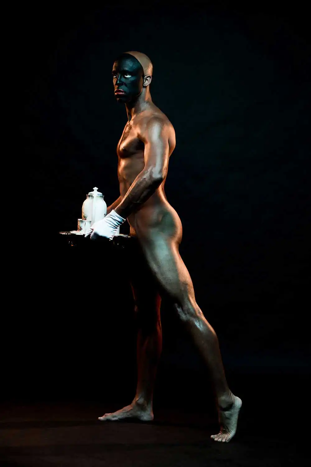 We focused on telling the story of David Bianchi’s envisioned to illuminate the disparity of black and minority presence in modern entertainment and media. The series begins stoic using elements of the white subservient gloves, (to indicate the role of the black person in elite white culture) against the nude form of a black man pained in blackface to make an oxymoronic image of himself.