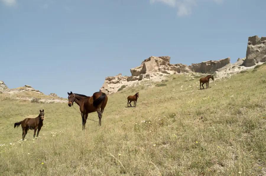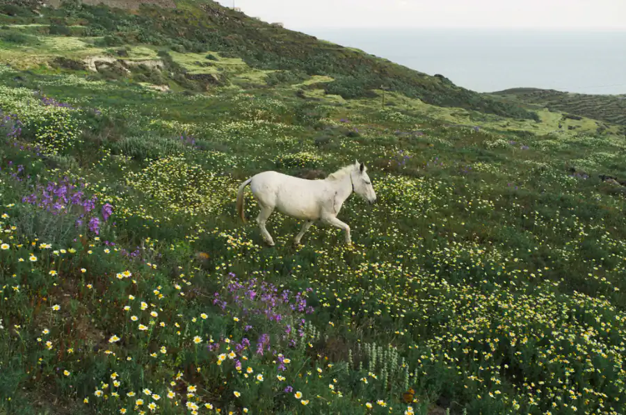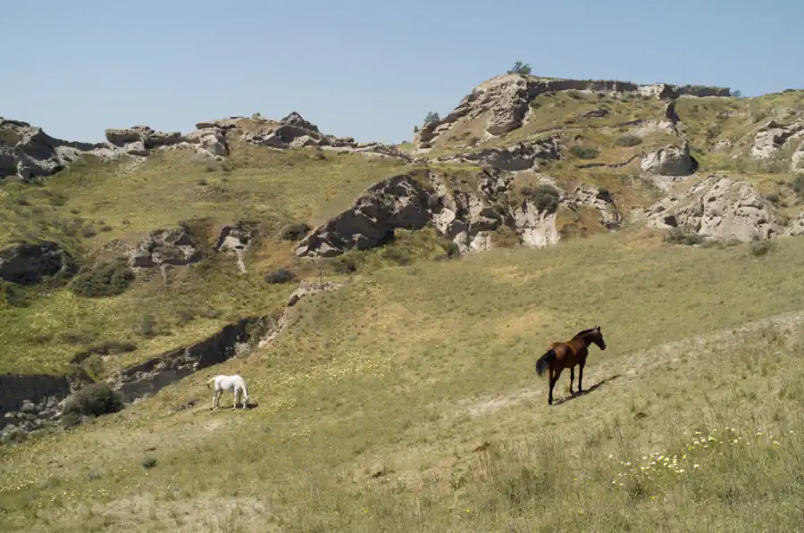 The island of Santorini rises like an enchanting secret, both hidden and revealed, both real and mythical, wrapped in the captivating drama of its prehistoric volcanic creation. The Spirit of fire still wanders among the black rocks of the island, reciting an ancient, hypnotic poem, vigorously narrating the story of its origin through the hieroglyphics that the lava ecstatically engraved in the untamed land. A strange, murmured voice that enchants like a Siren’s song echoes from the steep cliffs of the Caldera; this song is the sound of the muddled, common memory of our very own origin. It is the sound of a whispering that escapes the crater, the deep blue sea, the irregular cracks in the scattered stones, the dark lunar soil, the carved caves, the breathing of the grazing horses as they dream of their mythological ancestors; Eos, Aethon, Pyrois and Phlegon, the horses that carried the chariot of god Helios, the ancient personification of the Sun.