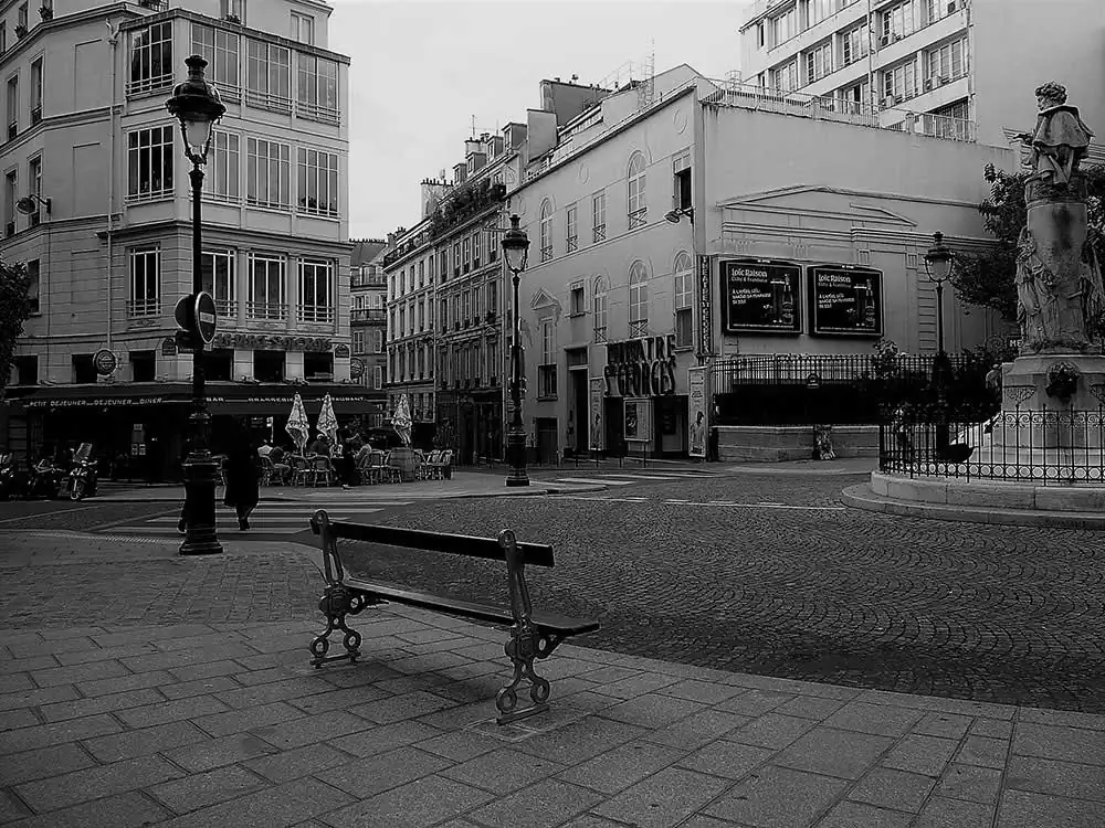 St. Georges Theater at a col-de-sac with a statue of a writer, just a lone parton heading for the cafe