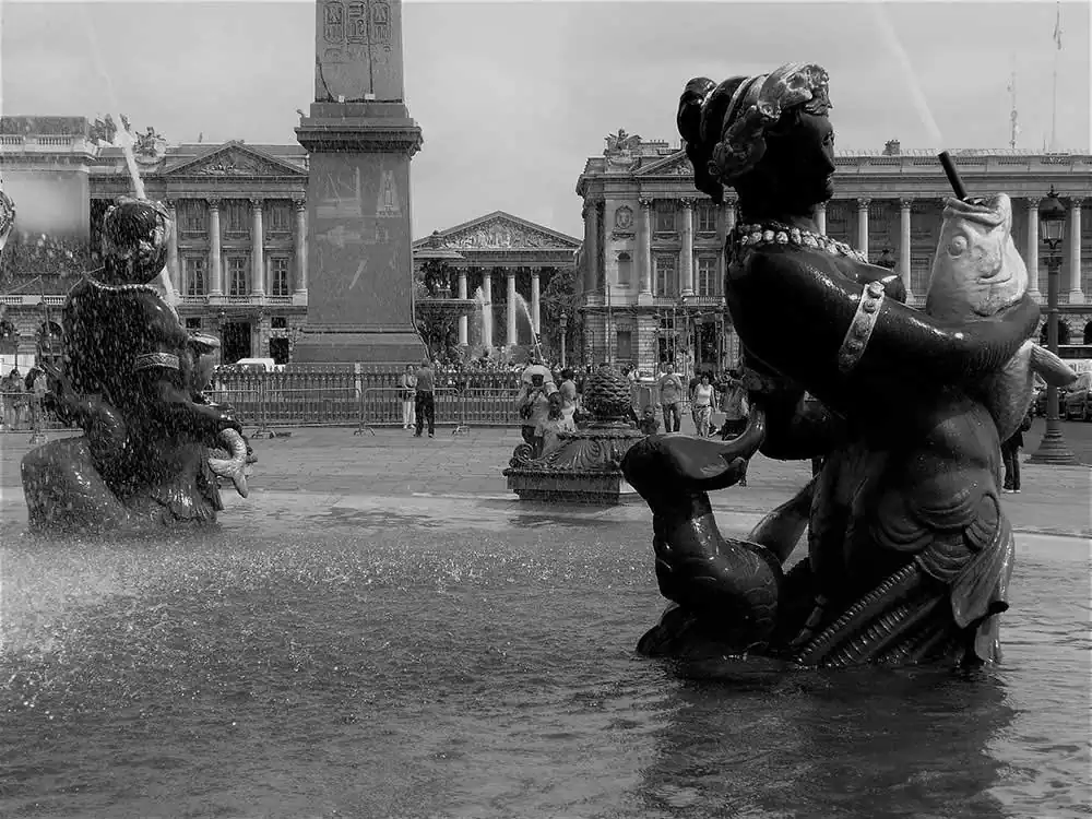 Place de la Concorde – a distant center view of the Madelaine through black mermaids