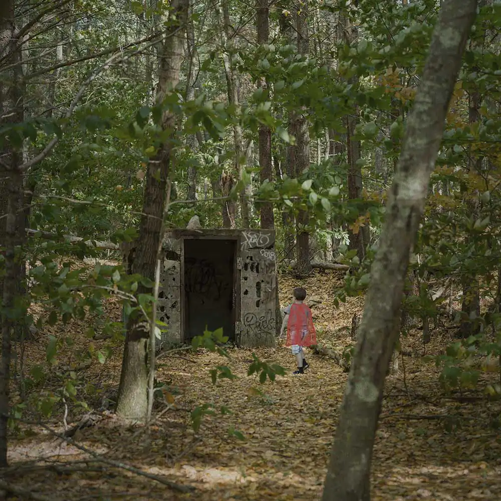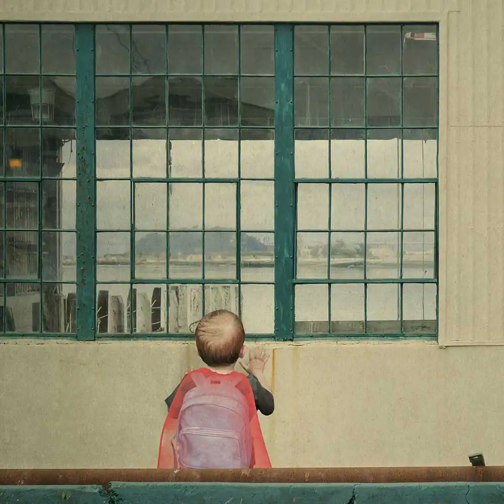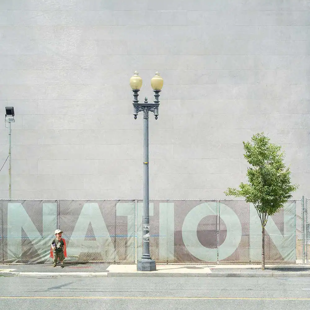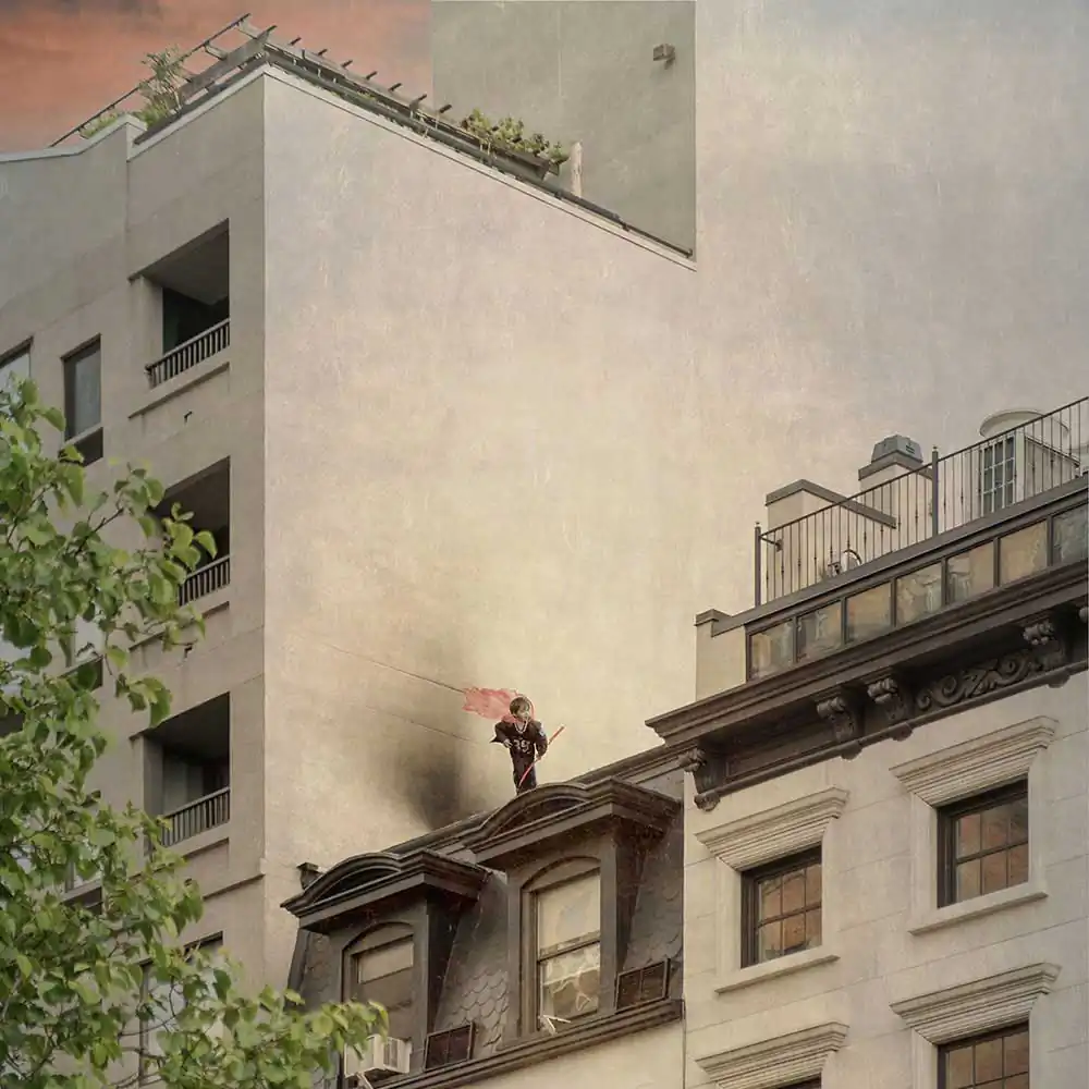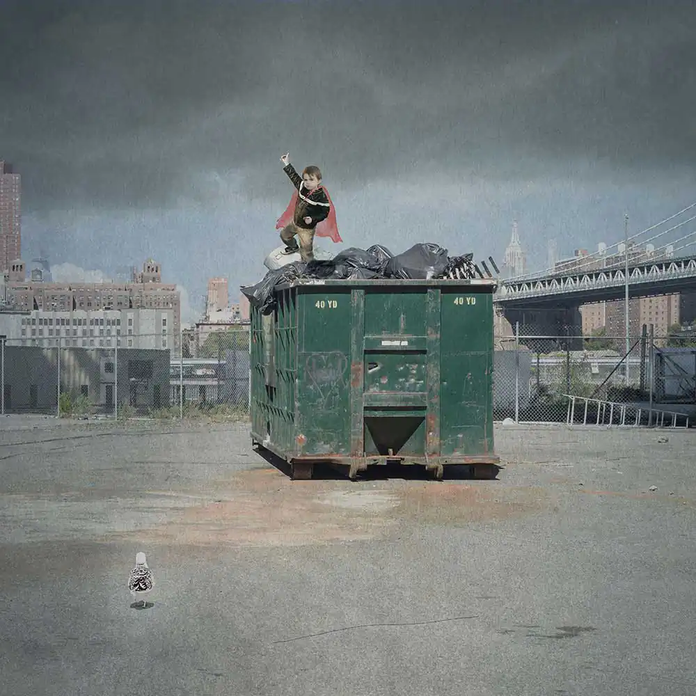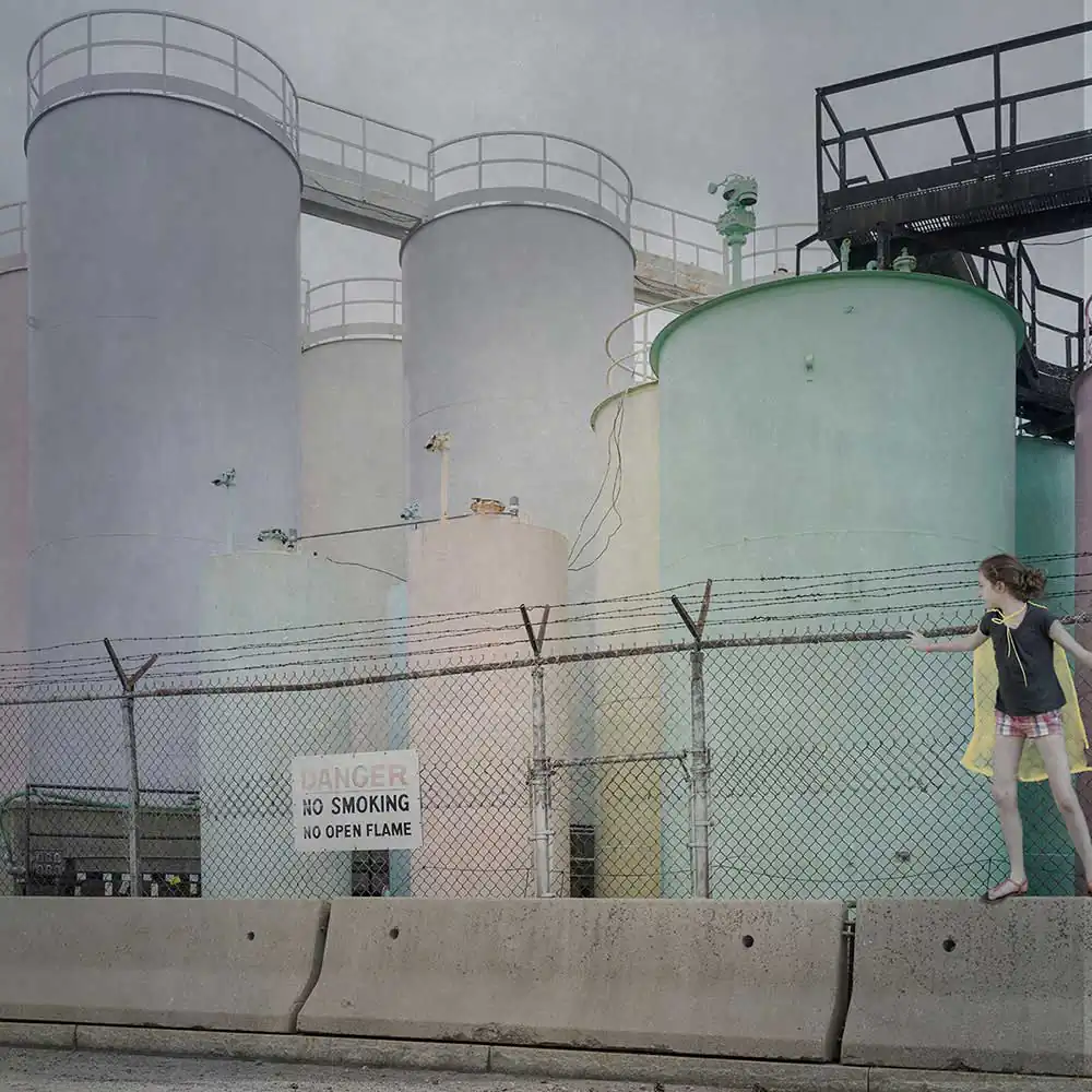 In this work, I transform images of my children when they were younger into superheroes. I have placed them in landscapes that foreshadow a desolate urban future.  I have given them brightly colored capes, a celebration of the beauty of the confidence with which, unfazed by the desolation around them, they believe that anything is possible. For many adults, the world now feels out of control to a degree we have never experienced before.  This work explores the idea that children, with their ability to continue to hope and dream, to use their imaginations to embrace the world and possibility, are the superheroes society needs to grapple with the challenges in front of us. But it also depicts a mother’s concern for her children.  There is an underlying impotence to their efforts to play at power.  In their vulnerability and helplessness, they embody the anxiety of a society on the brink, struggling to believe in the future, unable to confront true accountability for its actions.