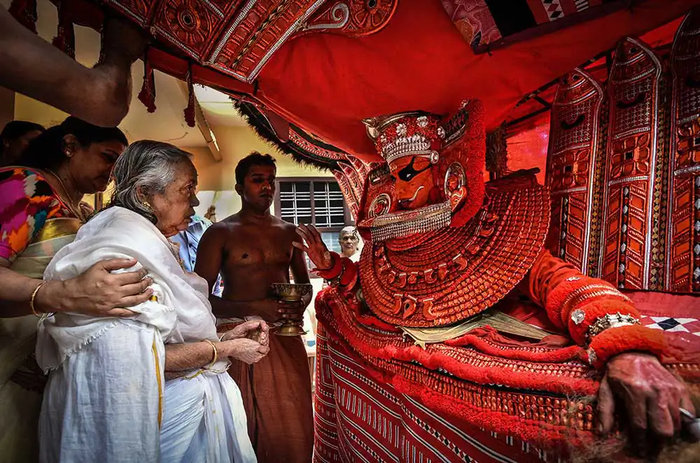 Theyyam performers wear heavy make-up, jewellery and very colourful costumes. The headgears, face painting, ornaments, dresses are truly majestic and create a larger than life impact on viewers. Local people consider Theyyam artists as God and seek blessings from them after the performance. These rituals can go on for hours, depending on how long it takes for the artist to enter a trance as he dances and spins to the drums.