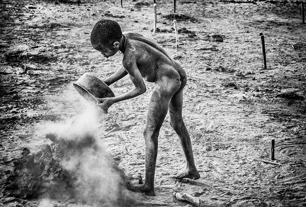 The children go naked or with a completely threadbare T-shirt, and they are dedicated to picking up and piling up the cow droppings. Women, even adults, also do this type of work. Later, they give them fire, and seeing the camp covered with small volcanoes expelling a great smoke is really impressive. With the resulting ashes they smear their bodies to protect themselves from mosquitoes. They also use these ashes to massage the cows: but these massages are so thorough that it is hard to believe it if you do not see them. This indicates the relationship or symbiosis that the mundaris have with their cattle. It could be said that they are nothing without their cows.