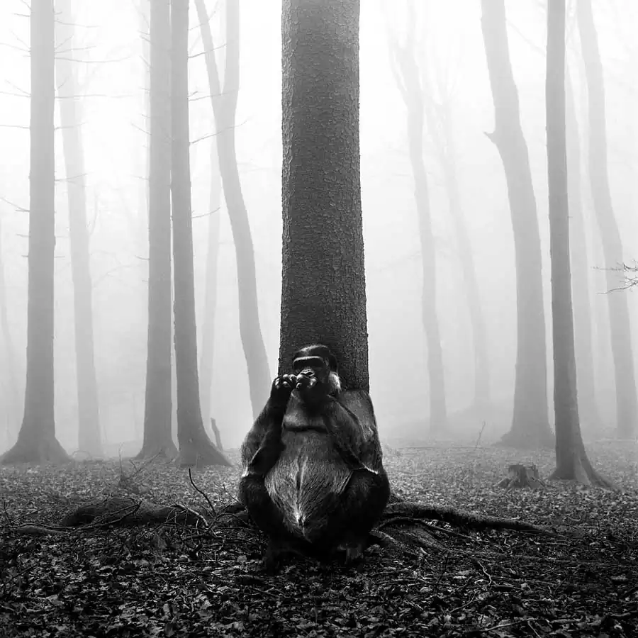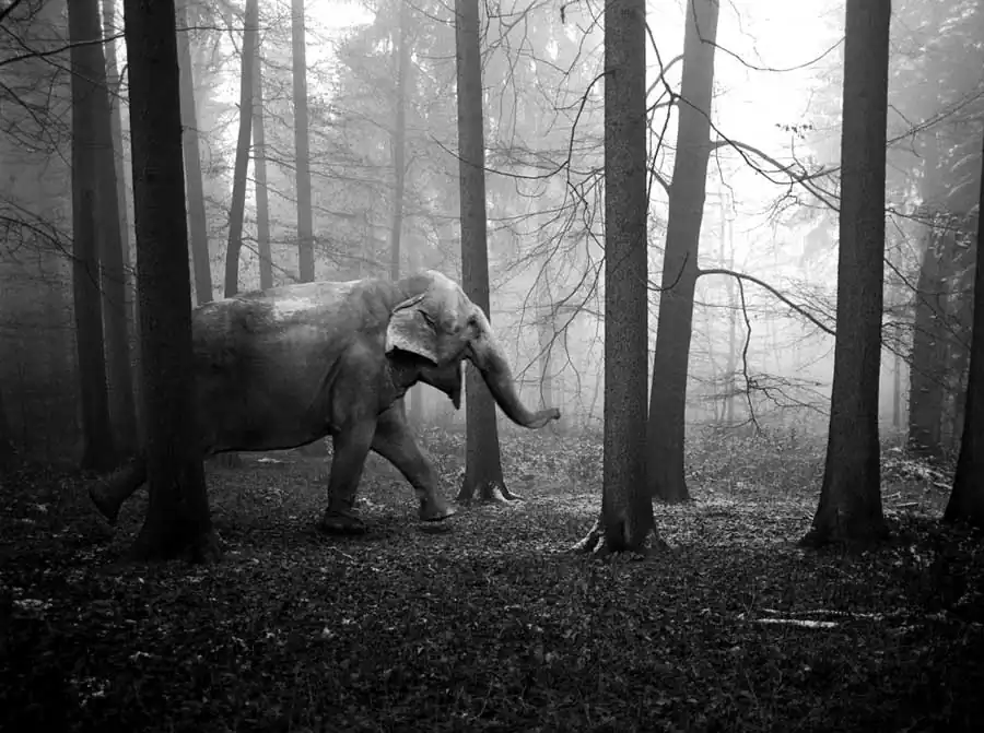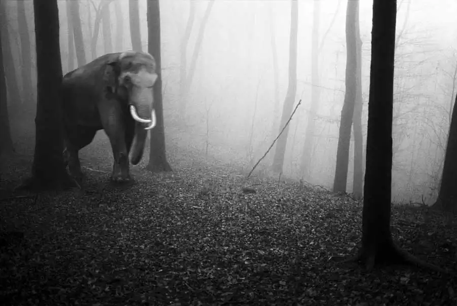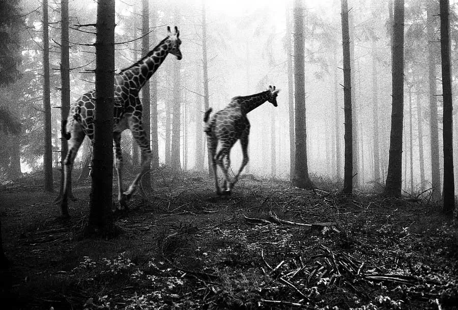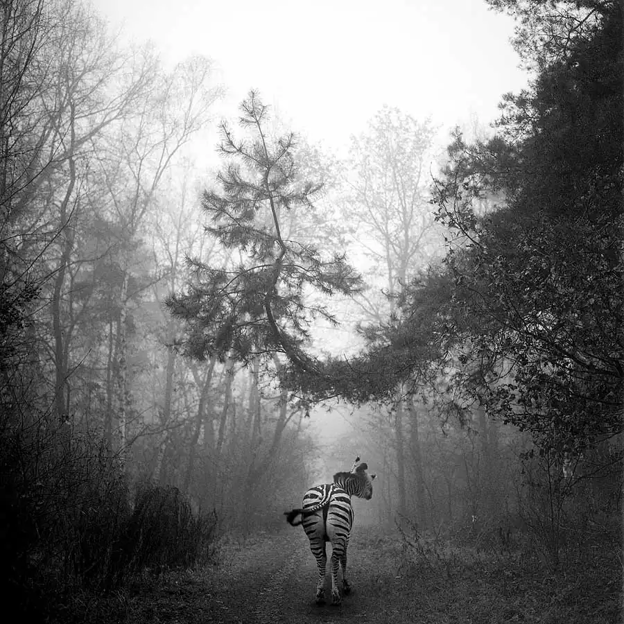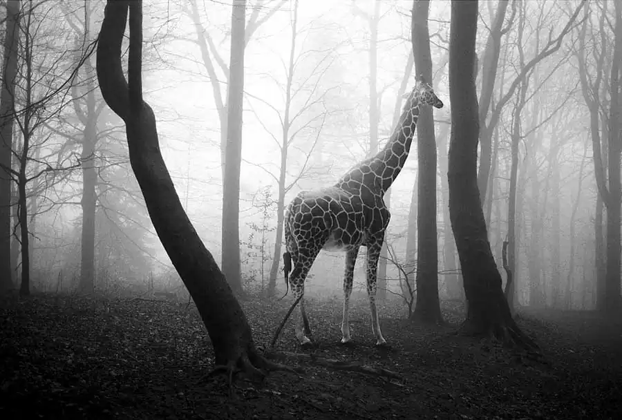 He was fascinated by the silence and the peaceful atmosphere there. One day he was watching a deer there. He was blown away by this mood. But in the german forest you can watch only a few species and not so often. So he had the idea to create these moods artificially with more and exotic species. All images of this series consists of two photographs. The forest images are all analog photographs, who he develop by his own with the classic chemical process and scan the negatives. The animal images are mostly digital taken in a zoo. The rest is craft work with photoshop. At first he photographed it wildly (both – animals and forest), but by now he take care what animal poses he can use with his forest images and vice versa.