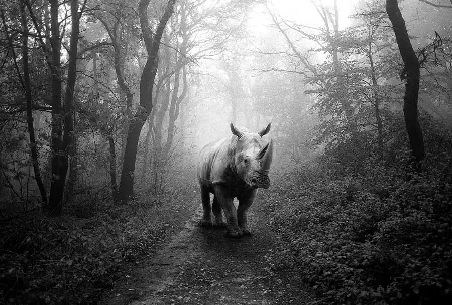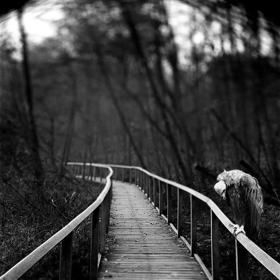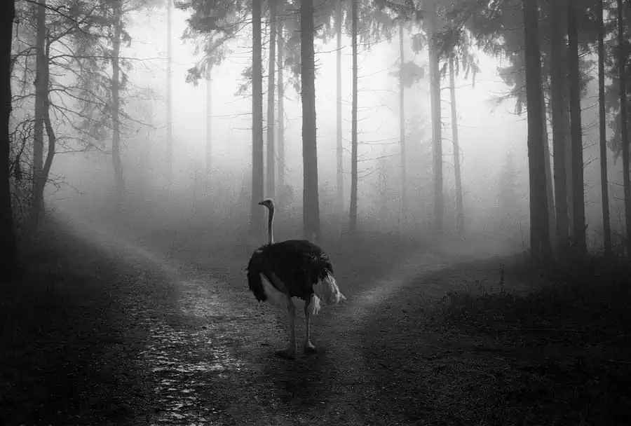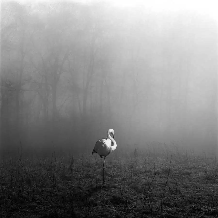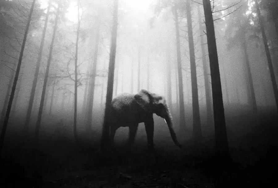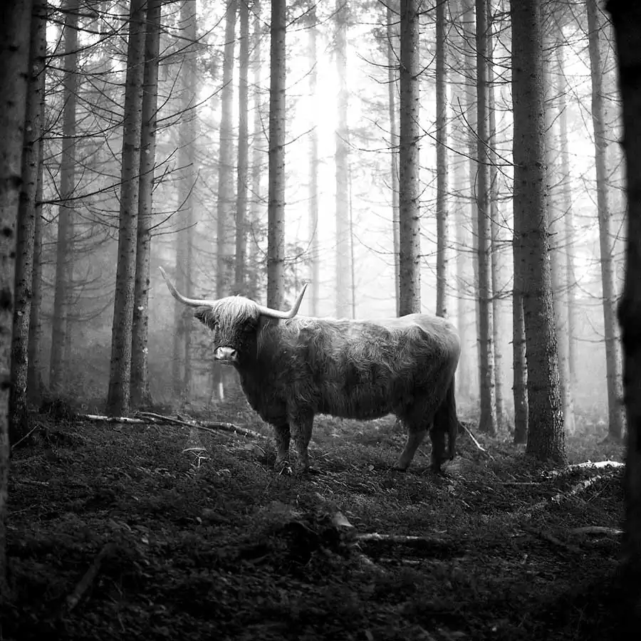 He was fascinated by the silence and the peaceful atmosphere there. One day he was watching a deer there. He was blown away by this mood. But in the german forest you can watch only a few species and not so often. So he had the idea to create these moods artificially with more and exotic species. All images of this series consists of two photographs. The forest images are all analog photographs, who he develop by his own with the classic chemical process and scan the negatives. The animal images are mostly digital taken in a zoo. The rest is craft work with photoshop. At first he photographed it wildly (both – animals and forest), but by now he take care what animal poses he can use with his forest images and vice versa.