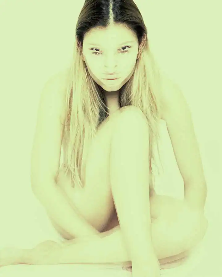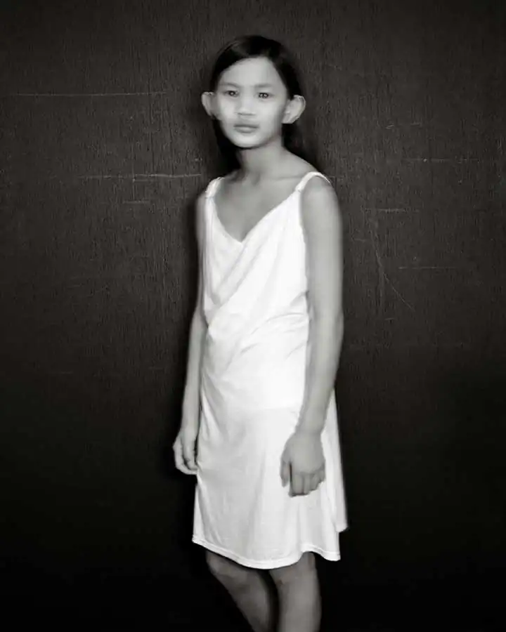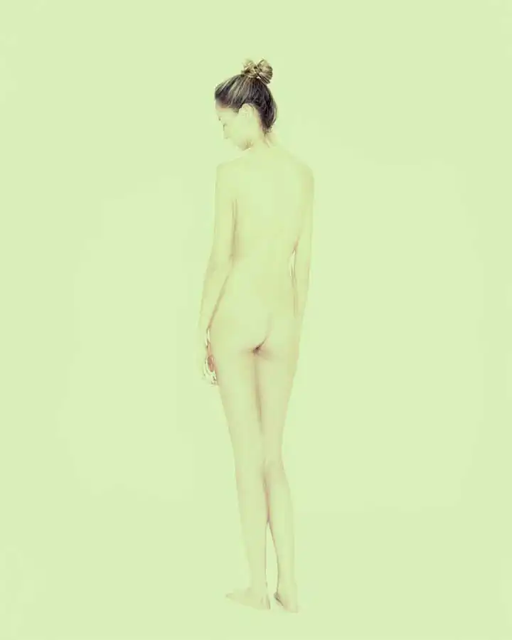 ‘I only photograph young females because I find them absolutely mysterious and pure.’ Van der Ploeg is looking for the most natural form of the model, which is the starting point in his work. He emphasises this aspect, enlarges it and shifts it to a higher level where the models emerges above themselves. It has been a very conscious choice to deprive the image of all context so all attention would be on the model. There is no use of makeup and the postures are not staged which leads to classical and natural compositions. By getting rid of all possible elements of meaningful context the model remains in her purest and most natural shape. He extracts the essence, which he enlarges and it amplifies the mystic around the model. The use of analogue photography and his own technique enhances this: the duplication in the image works in an alienating way and creates an intangible feeling.