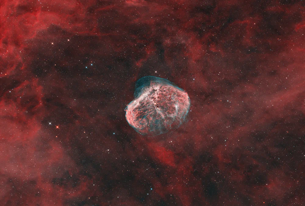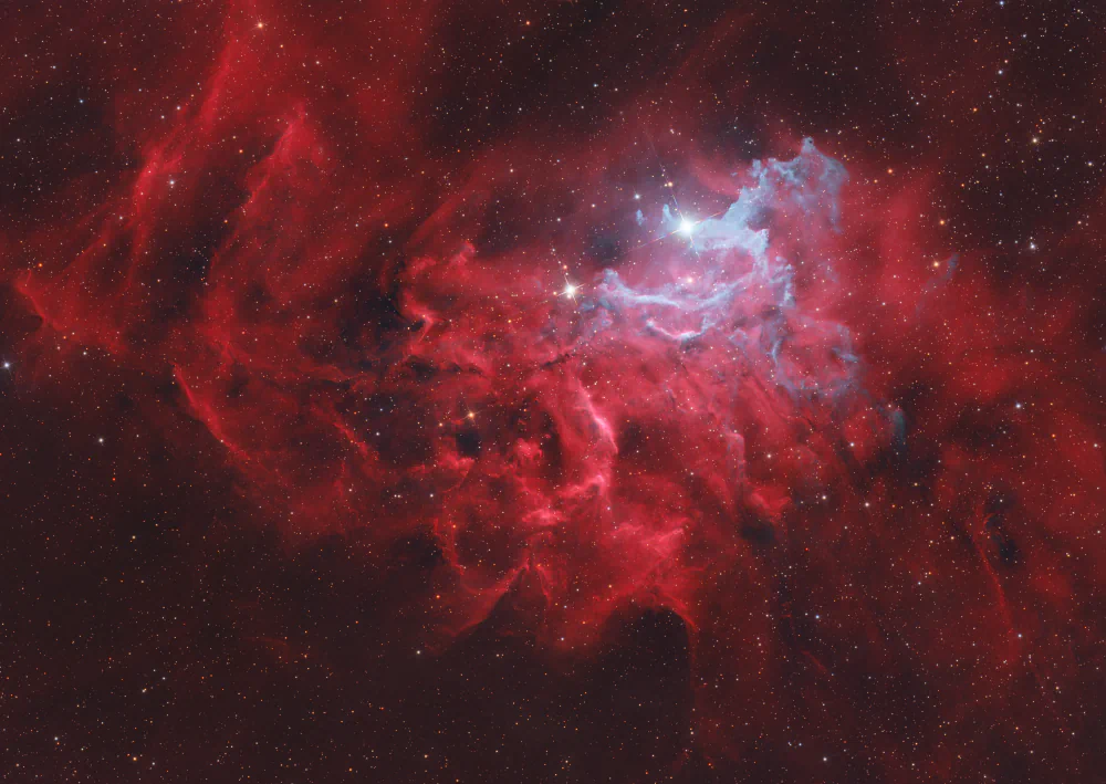 Deep-sky photography inherently confronts the limits of human perception. The human eye is incapable of perceiving the true luminosity and complexity of distant celestial bodies. Colors, structures, and contrasts remain invisible unless revealed through prolonged exposure and the accumulation of light over time. Roda embraces this limitation as a conceptual foundation of her practice. Each image is the result of an extended process of observation, patience, and technical precision, in which time becomes both subject and medium.