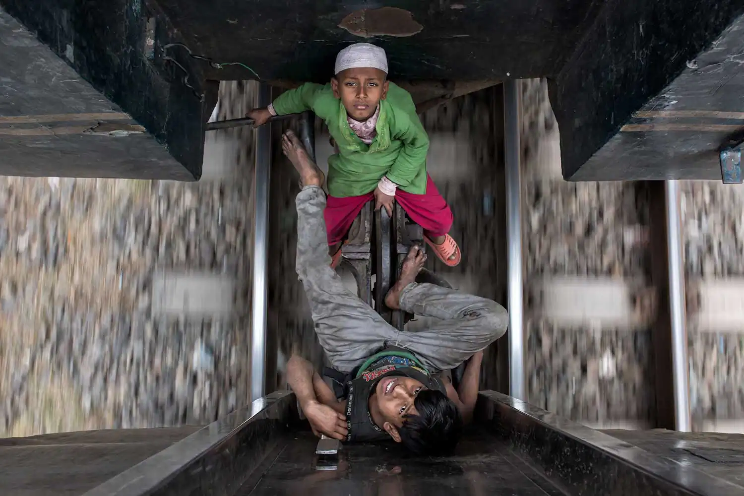 Taj and Akash they travel every day from station to station with their mother begging to make a living. Train surfing is not without risk, even if dangerous and illegal, is a common form of transportation in Bangladesh. People have suffered electrocution, severed limbs, falling onto the tracks and colliding with tunnels. However, this can not stop them and jump onto moving trains running away from the police bamboo sticks become daily routine (Arichpur, Bangladesh).