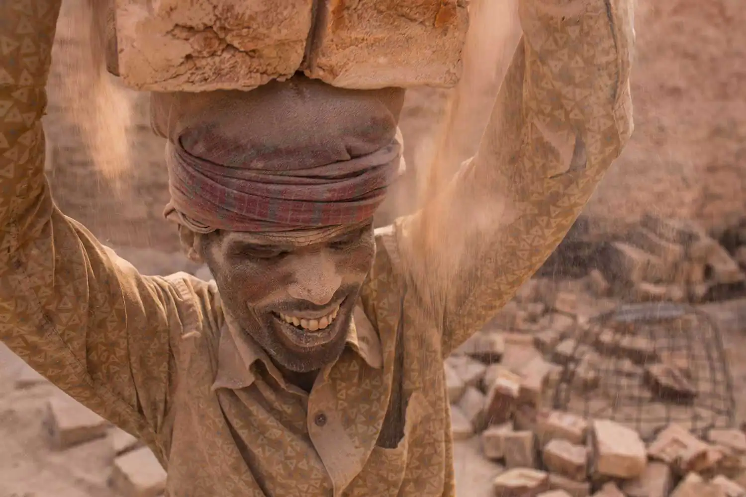 Thick clouds of smoke hang in the horizon above tall and slender chimneys. It’s like a scene from a long-gone age. Men and women, among the debris, walking in single file up and down steps as if climbing a pyramid. Toiling under the baking hot tropical sun, these lost souls are carrying out back-breaking and exhausting labor in the most perilous conditions through days that pass equal to one another (Hemayetpur, Bangladesh).