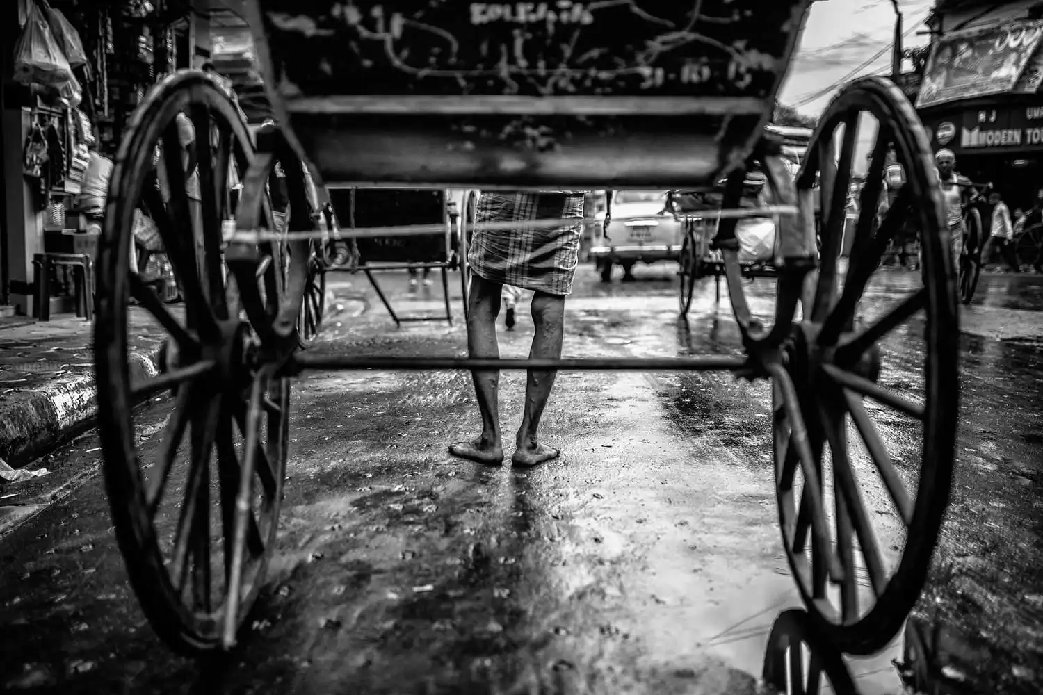 – Mustafa wakes up every morning with the first rays of the sun that, through the roof of his wheeled-house, caress his face, playing and hiding between his wrinkled skin. It starts here, every morning, his daily struggle. Waiting for the passengers and attracting them with his smile, slamming the aluminium bell against the wooden staves. Racing then, once the client is on board, in the maze of streets of Kolkata, exhausted in the crowd of people that attack him smashing him against the walls. Naked feet in contact with the hot melted asphalt. His shiny back covered with sweat and his thin but muscular arms that balance his business-tool (Kolkata, India).