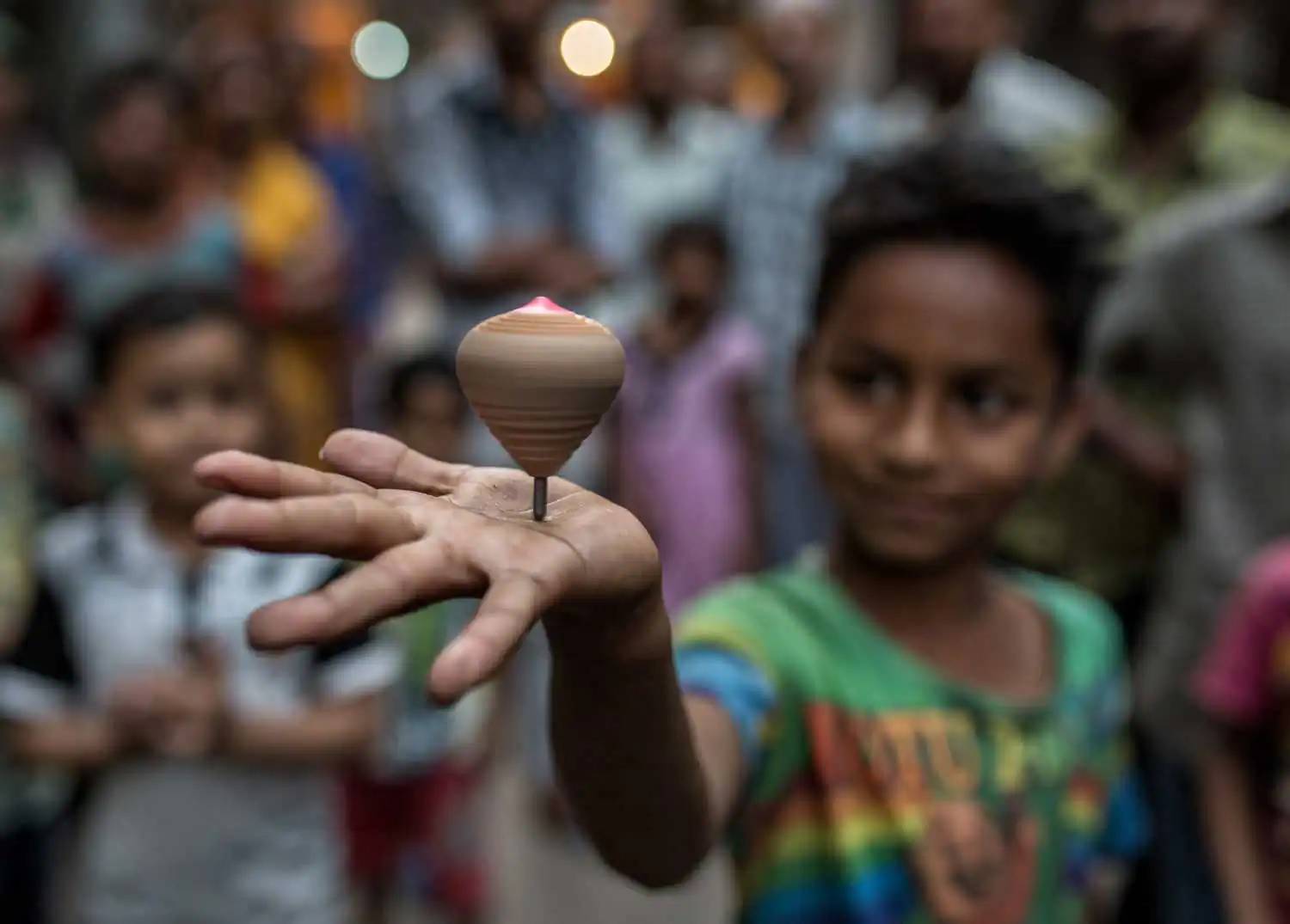 – The wooden spinning top (“lattu” or “latim”) is a popular game that is played in many parts of India and Bangladesh even today. A cotton string is wrapped around the lower half of it, then thrown on the ground with a jerk and the string is pulled out as the lattu moves round. The children take turns at spinning the top, and the one who spins it the longest, is the winner. Jai, 9 years old, is the king of the street here in Mohammadpur district, showing me how he spins the lattu in his palm (Dhaka, Bangladesh).
