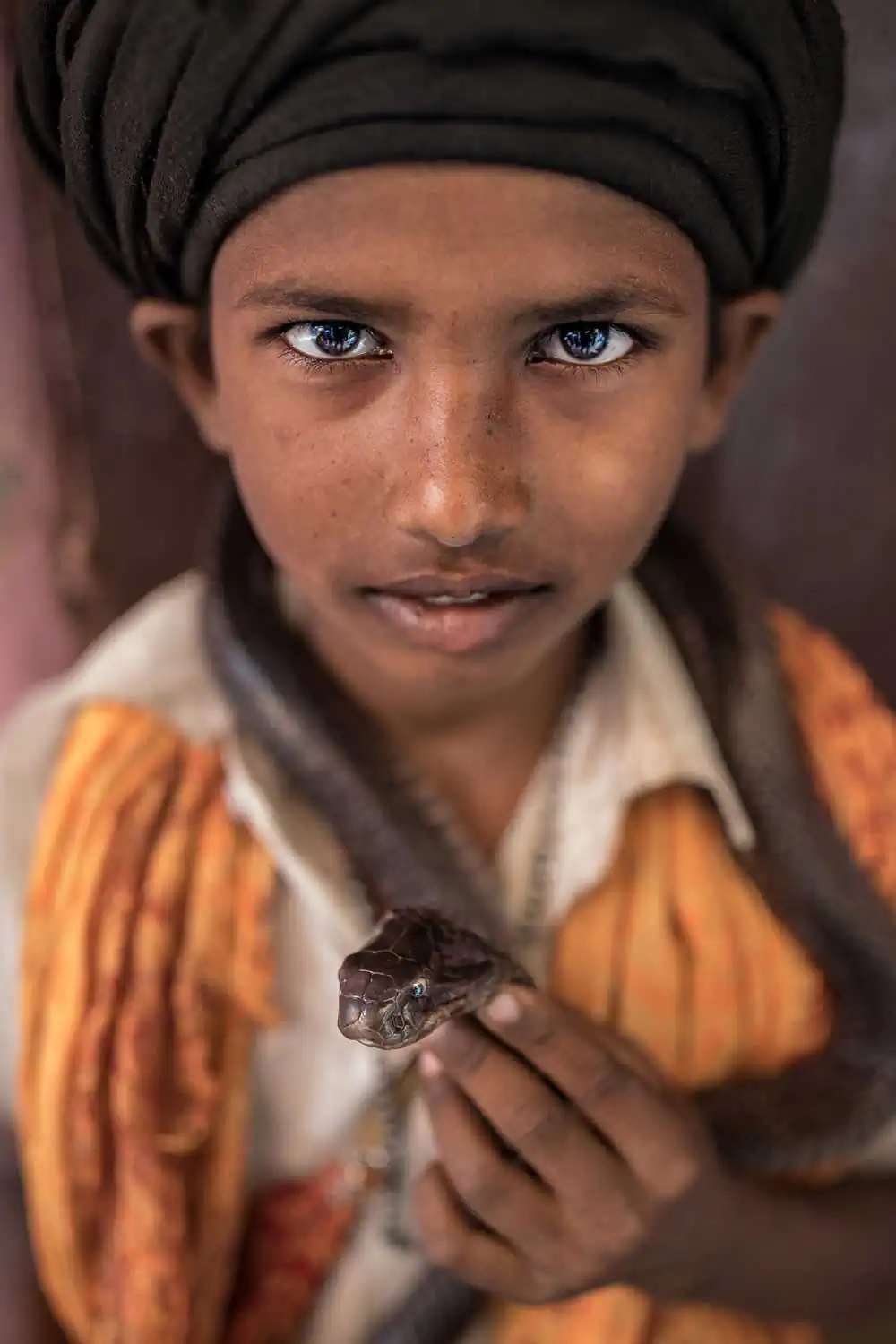 – He was born and raised together with the cobras, his most loyal companions. Karan, 11, is the member of an ancient tribe of snake charmers from Kanpur, who over the generations have captured poisonous snakes, making them dance to their music. Snakes are revered in India and snake charmers are considered the followers of Lord Shiva, the Hindu god always portrayed with a cobra around his neck (Kanpur, India).