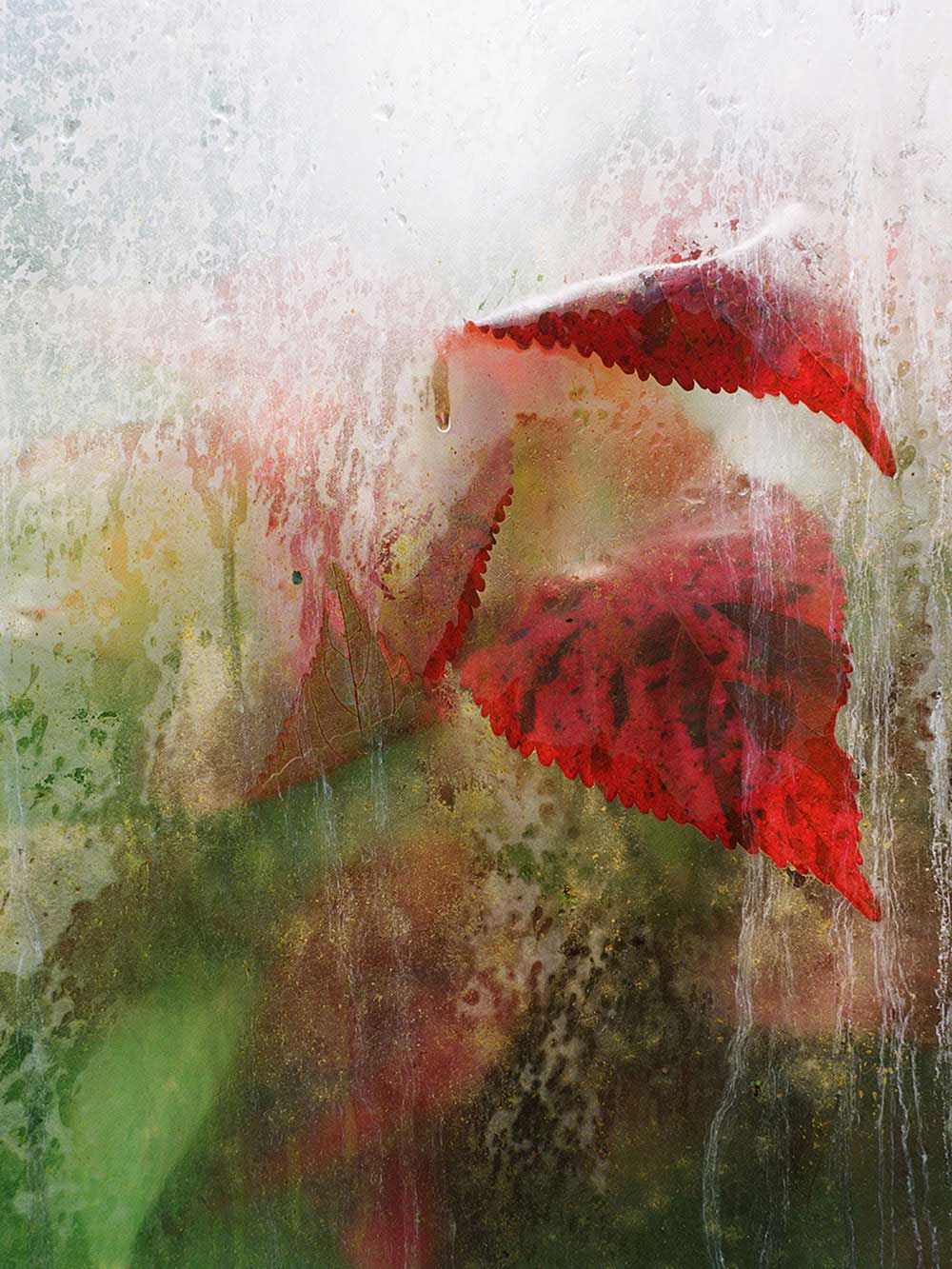 Caroline Gavazzi has photographed a number of plants held in a greenhouse that both protects and imprisons them, depending on your point of view. Before photographing them, she observes and studies them, but it is the colours and indefiniteness of shapes that suggests to her a vision of the world such as the one of the artistic movement she loves and favours: Impressionism. Moving away from realism is her choice. Caroline Gavazzi also confronts herself with glass, the one through which she photographs these plants: she plays with light, focuses on the droplets that run across the glass, creating unexpected colour effects. The dialogue between inside and outside is now more intimate, as it is the photographer herself who enhances the intensity of her feelings, the strength of the sensations she wishes to share with those observing her works. The plants are pervaded by intense vitality: you can notice it when they crowd towards visibility, when one lays a leaf on the surface of the glass, when a flower blooms silently removing itself with quiet modesty from direct sunlight. It is not, even though it would seem so, a fairy tale intuition – the most recent plant neurobiology research confirm how plants have an ability to “see”, chasing light, moving to seek it out; how they perceive sound through vibrations, and recognise the signs of danger.