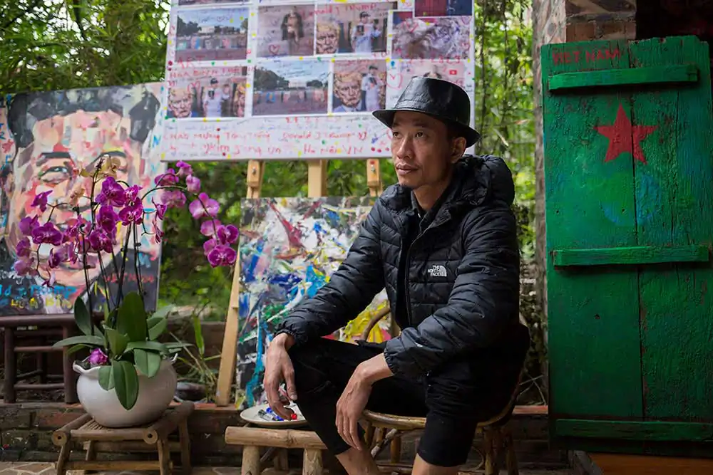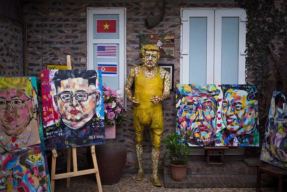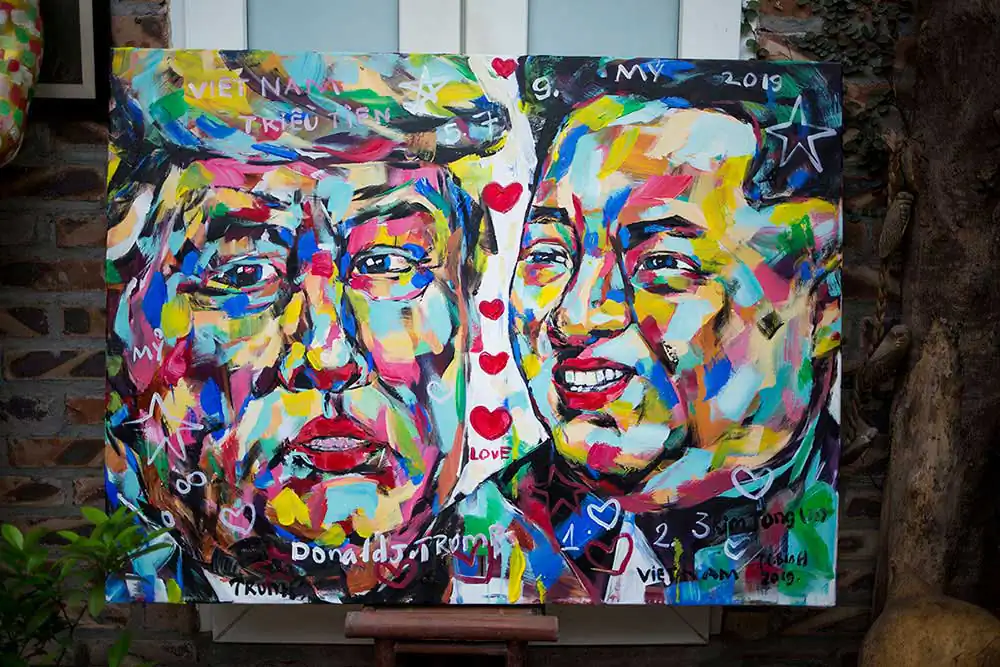 Binh Tran Lam, a 37 years-old artist, focuses his reverence for Donald Trump in other aspects. He finds inspiration in his physical appearance, like his eyes and gestures. The artist draws Trump and Kim paintings in his cafe-studio in Hanoi.