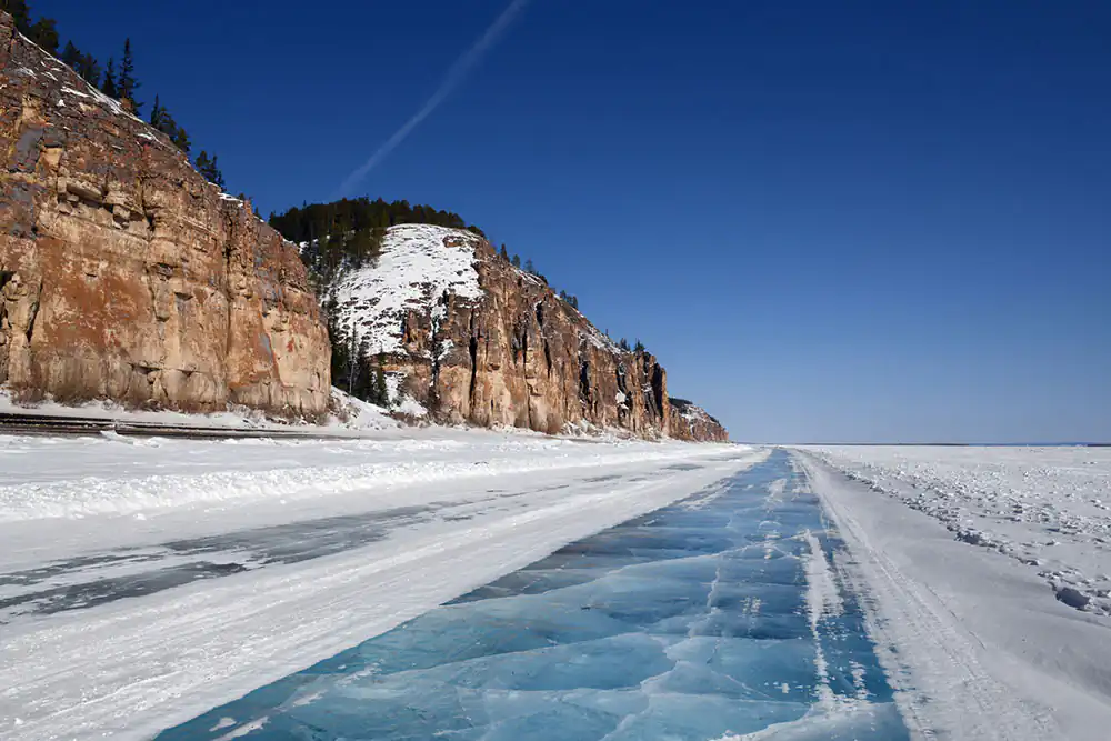 The Lena river leads to the Arctic sea where the Lituanians and the people from the region of Churapcha were deported to. In the winter the river is used as an ice road.