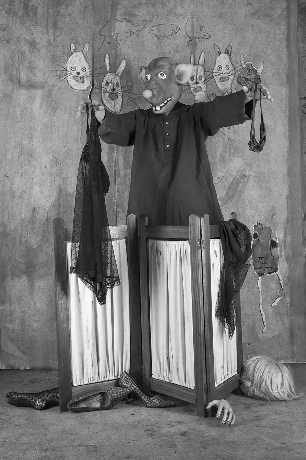 I cannot remember when I put this rat and in abandoned buildings. Piece by piece I had mask on for the first time. Maybe I was born with it. I am not sure what is underneath. I never take it off: I sleep with it, bathe with it. I have heard people call me a rat and others a human with a mask. I am unsure whether I am a rat or human. Perhaps my mother was a rat and my father a human. I think I am a bit of each.