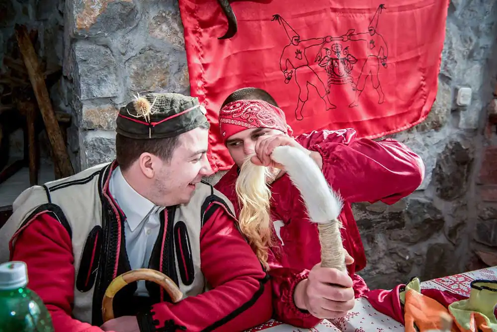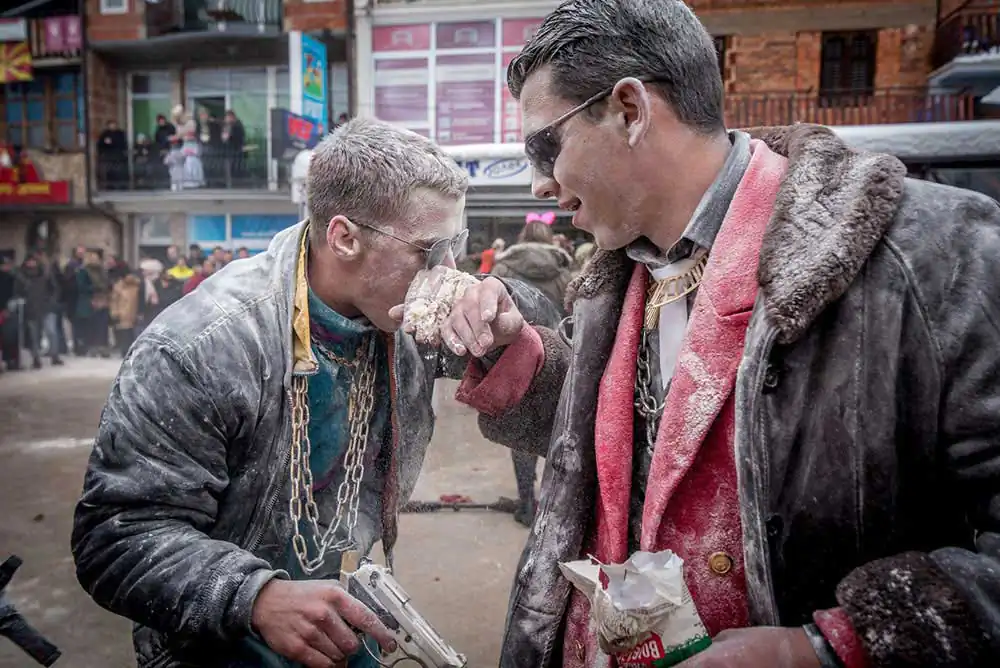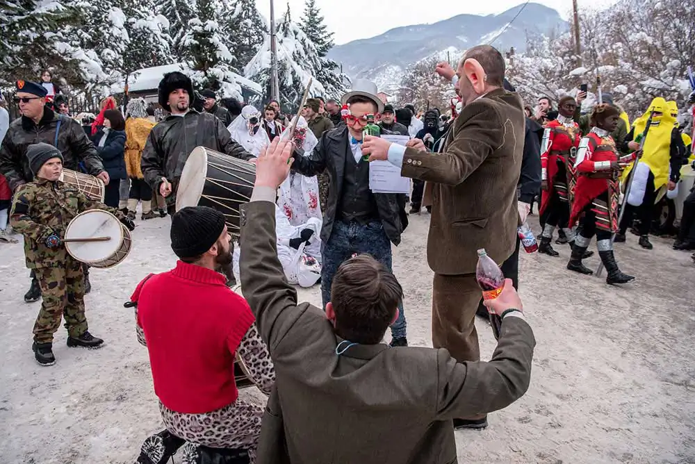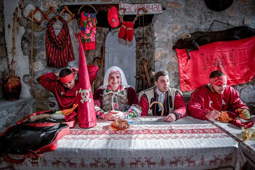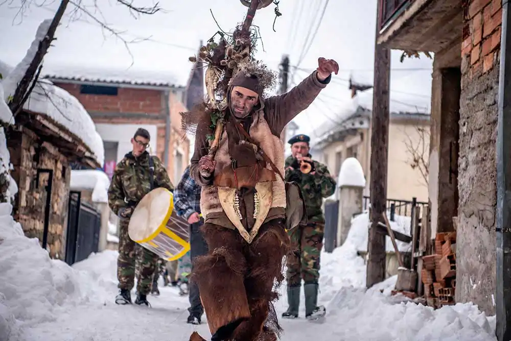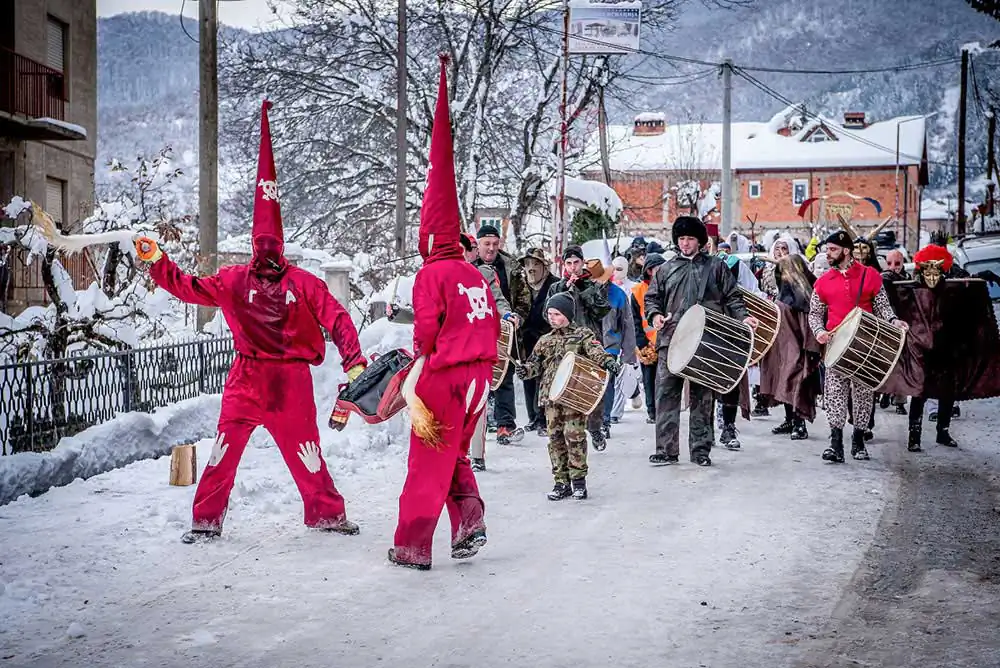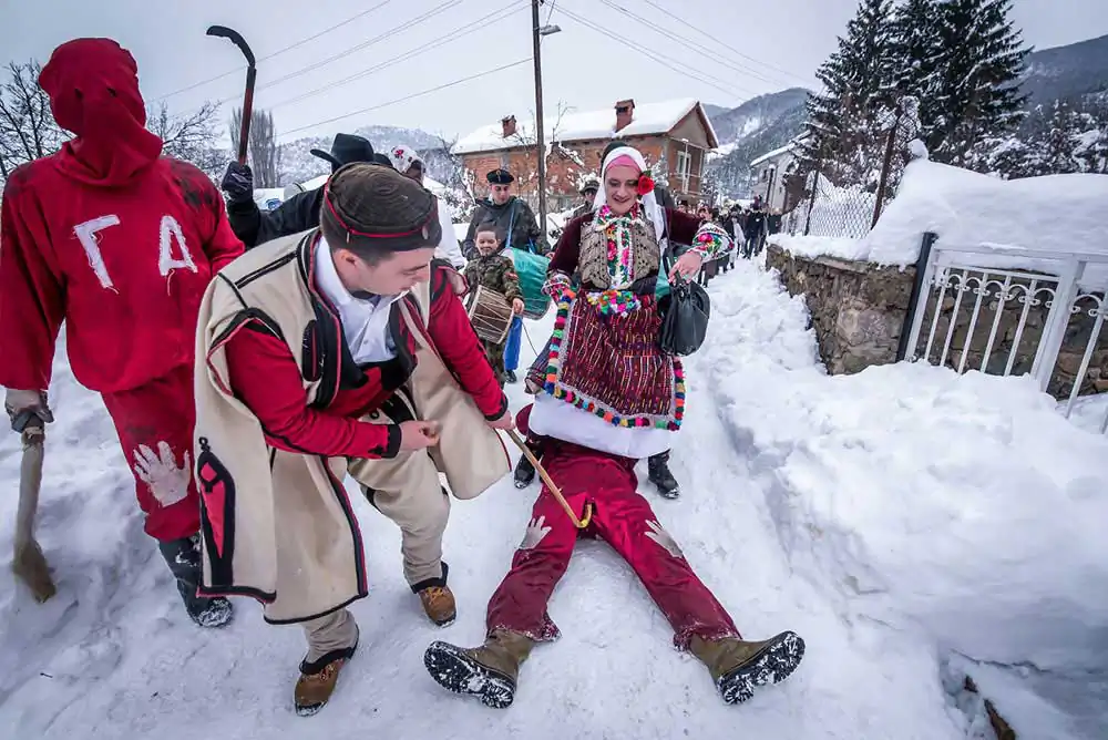There are three traditional masks: bride, groom, August the Stupid and musicians. The bride is man disguised as a woman, dressed in traditional folk clothes. The role of August the Stupid is particularly distinct. Young people, full of energy bear this mask and communicate with the audience by peculiar movements and gesticulations, waiving with whips made of animal tales trying to chase away the bad spirits as they walk ahead of the bride and the groom. In the early hours of the 14th of January on temperatures down to -20C around 2am most of the village follows the bride and the groom to the springs where they collect water that they use to make the special bread the next morning. In the morning of the 14th all disguised people also called Vasilicari go around the village visiting each household that has the name of Vasil, dancing and singing in each house. During the carnival, the disguised participants enjoy all possible freedom and passion to “place the world upside down”, freedom in which the creativity of the spirit is expressed, as well as the sense for improvisation, criticism and sarcasm. On the end of the Carnival the masks are taken off and burned in the middle of the village a symbolic act of purification to chase out the evil spirits.