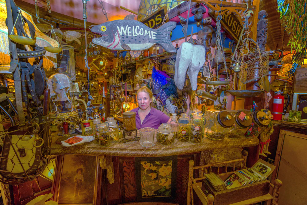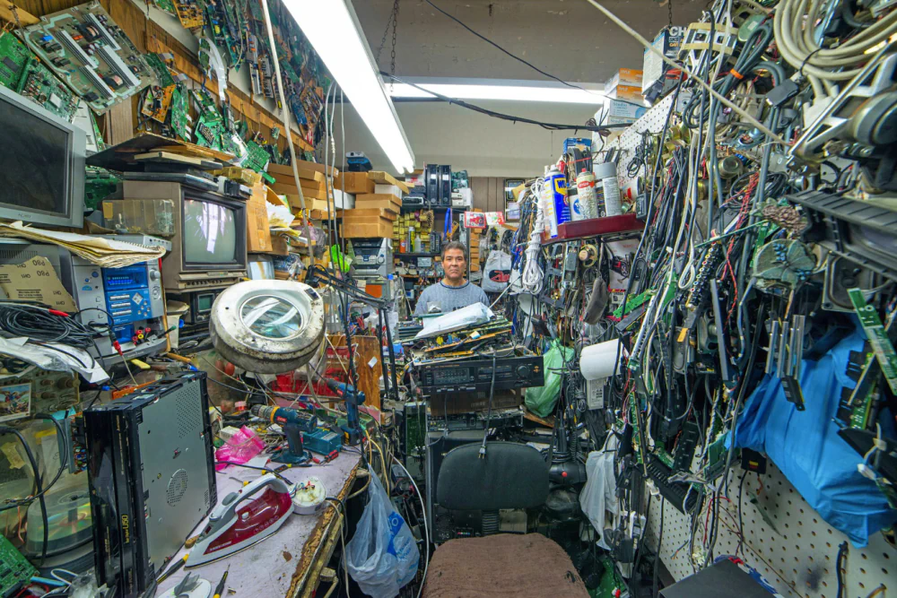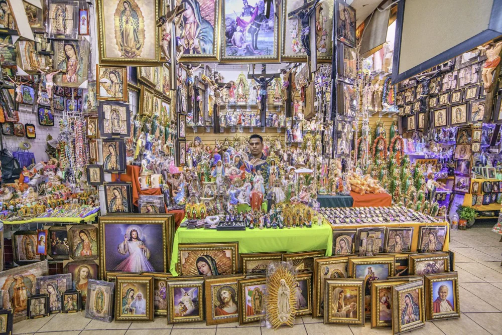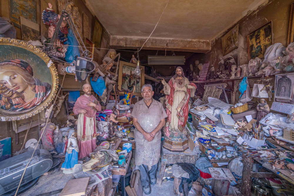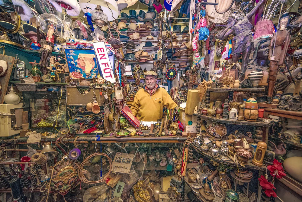 All portraits share a consistent composition and focal line. His deliberate use of a very wide-angle lens amplifies the grandeur of each space and establishes an unusual relationship between the photograph and the viewer, who is immediately drawn into these colorful and visually dense environments. Paradoxically, what might at first appear as clutter, or even hoarding, becomes majestic and almost magical. These spaces transcend their function as simple shops, transforming into urban temples that carry a sacred dimension.