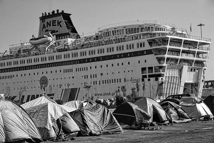 For the luckily who survived is started a new hell, waiting their destiny in tent camps outside Athens or inside the Pireo harbour. Here, near huge cruise ships full of tourists, more than three thousand people, especially families, try to survive in a tent camp inside an old, dark, crumbling building. Once, this construction was used as magazine for merchandise from all the world. Today, people from Syria and Afghanistan are clups as objects.