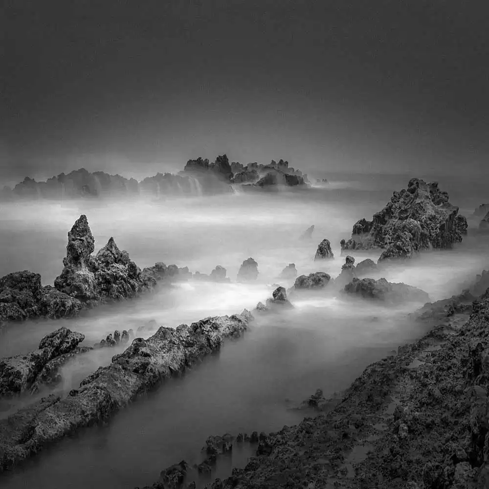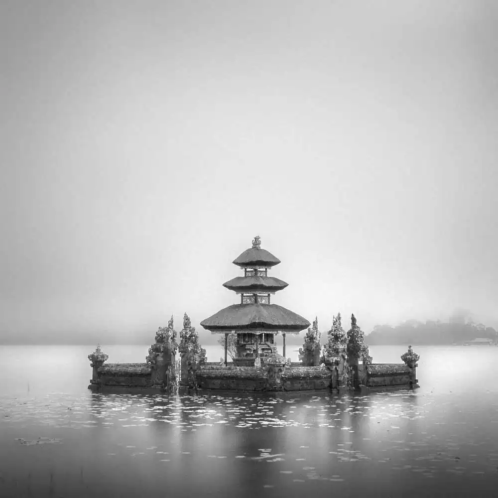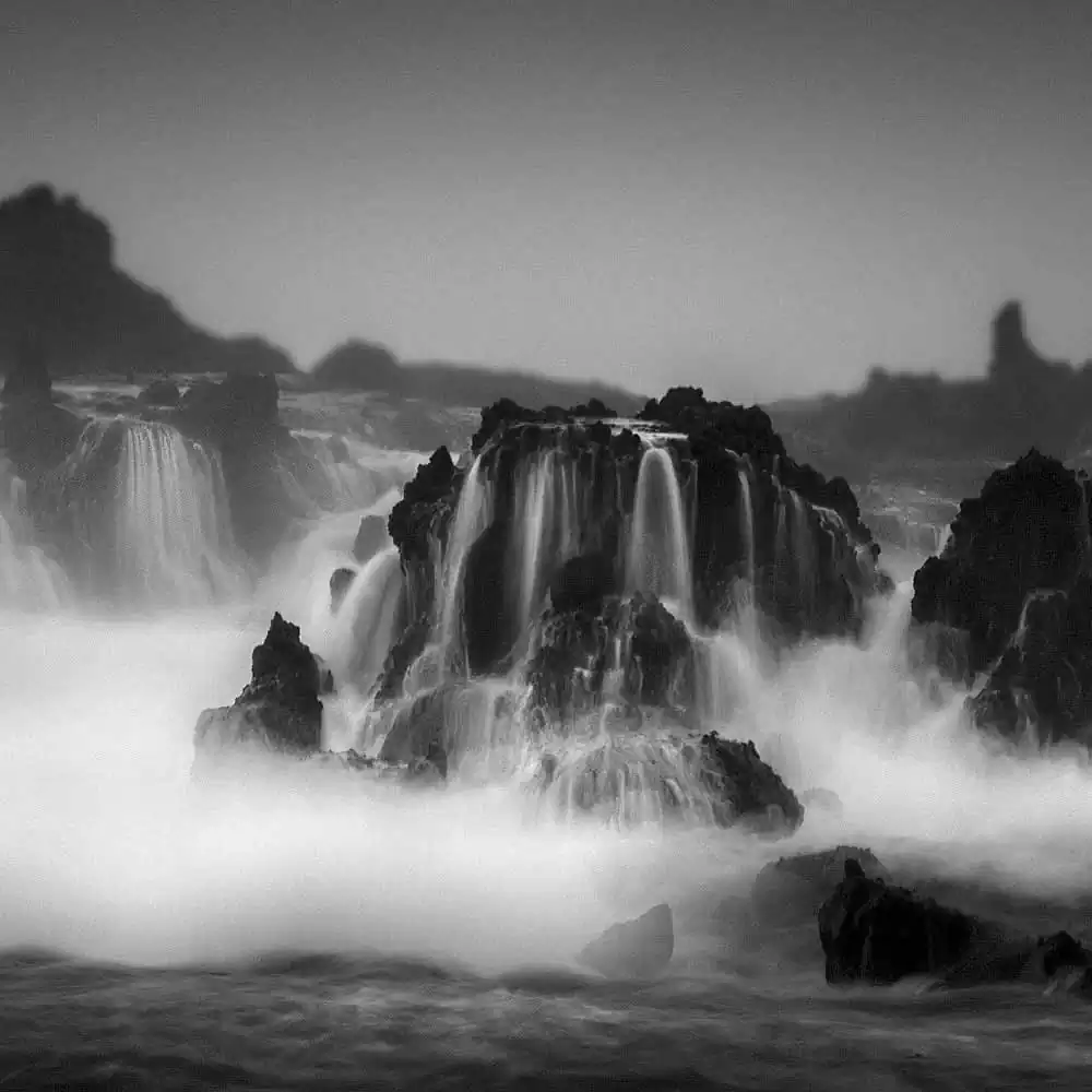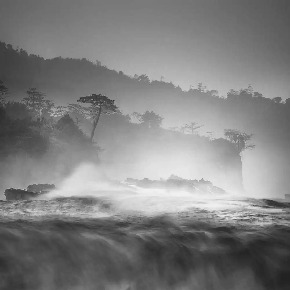 Captured in its various countenances, water poses in these series as an enchanting backdrop to the centre stage figures. It roars through the gaps among a group of stoical rocks and it dances around a water temple creating a mystical mist.