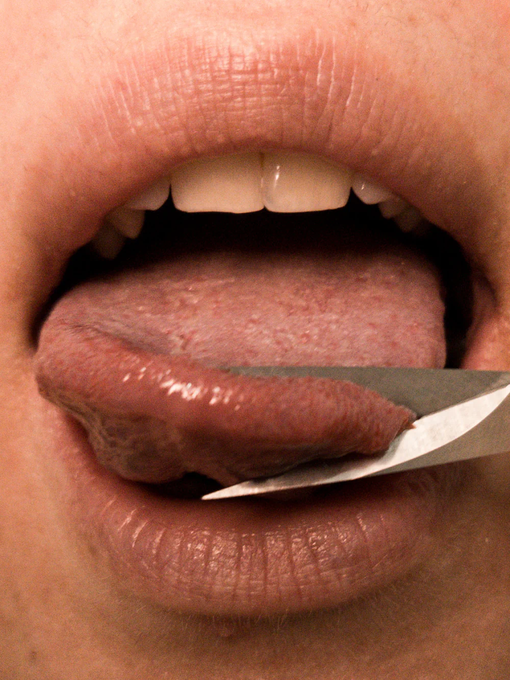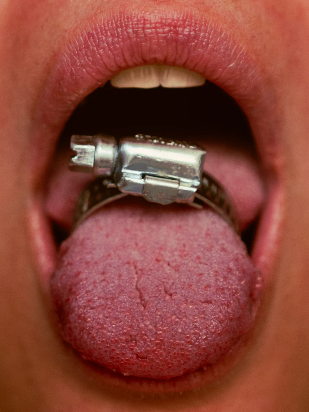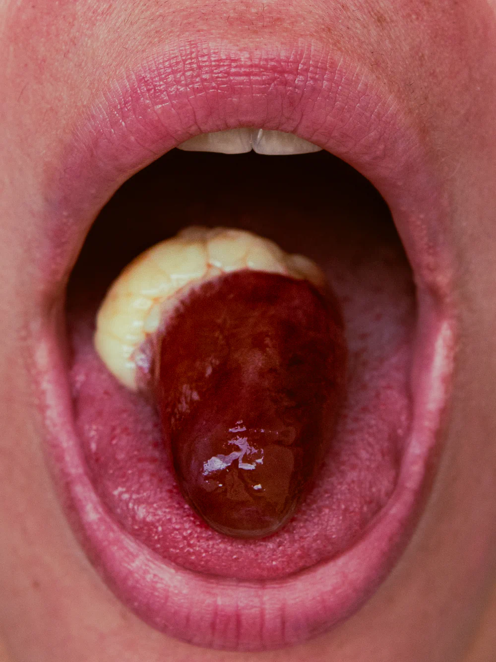 By isolating the mouth from any identifying context, she removes from the viewer the familiar tools of classification. There is no face to read, no identity to assign, no narrative to resolve. What remains is the image itself: a threshold between the tolerable and the unbearable, held open with precision and without apology.