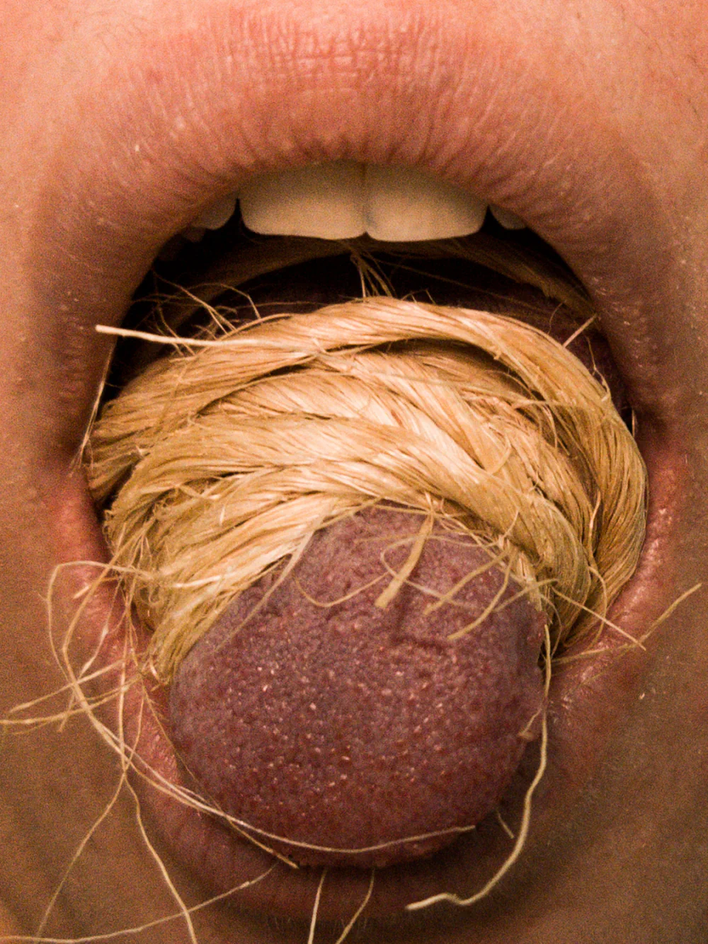 Working through self-portrait and photoperformance, Gabi Coêlho places objects foreign to the body inside or against the mouth: barbed wire, fish hooks, scissors, hair, and a chicken heart.