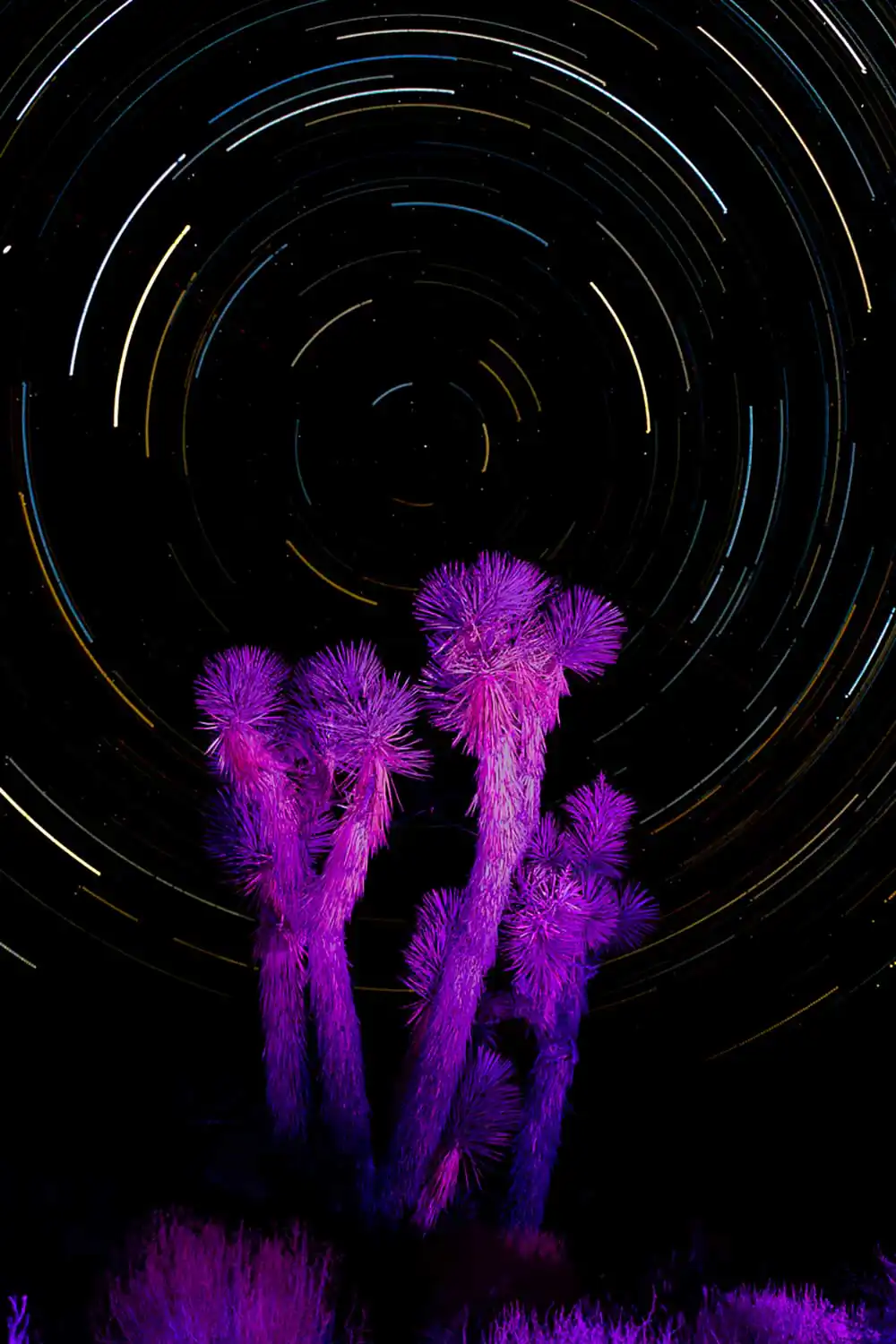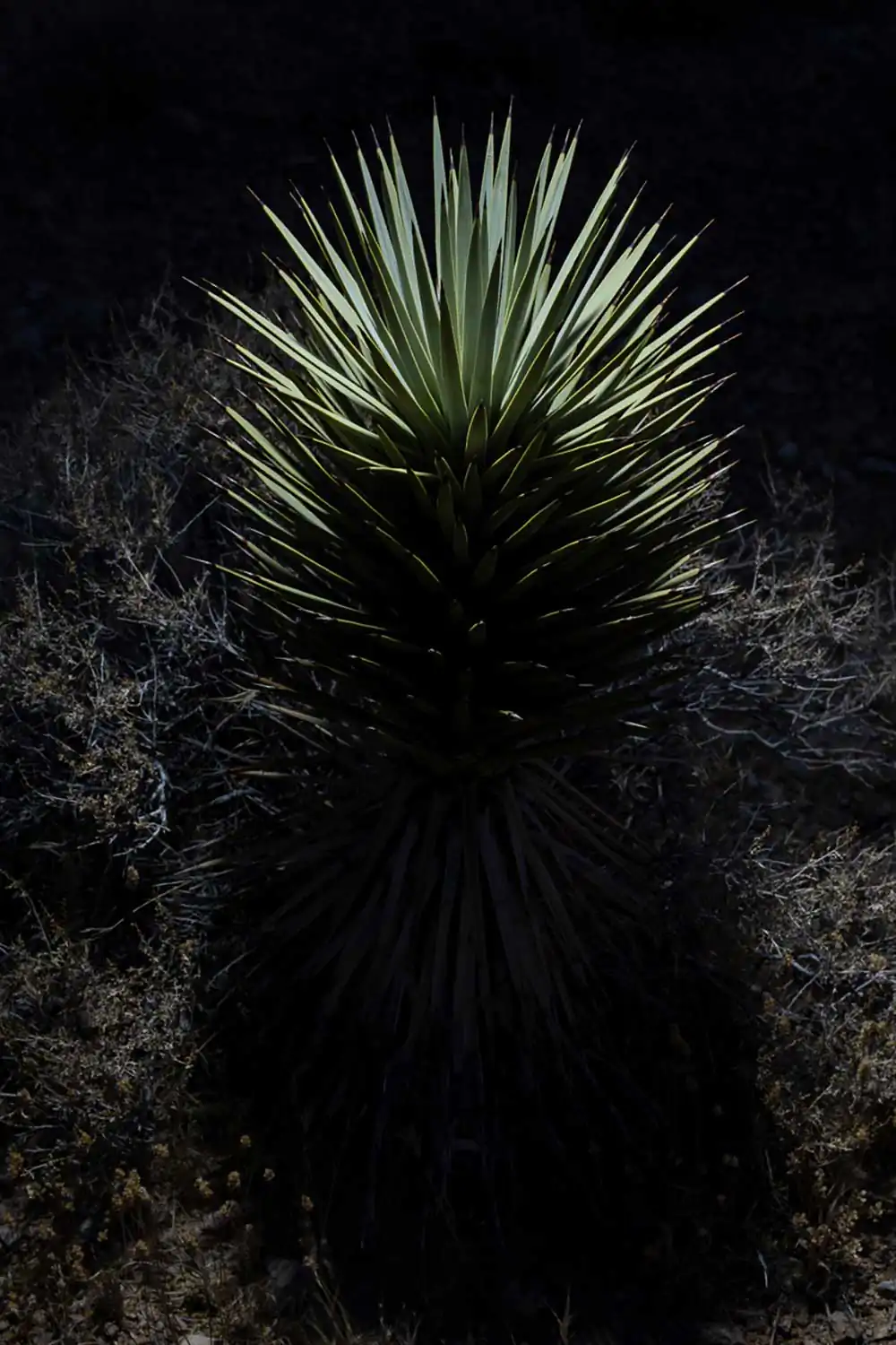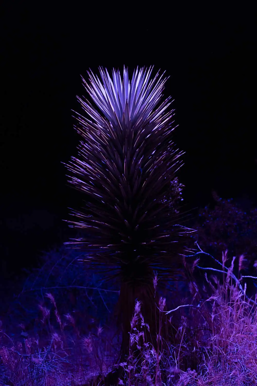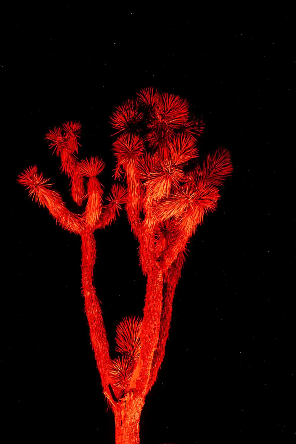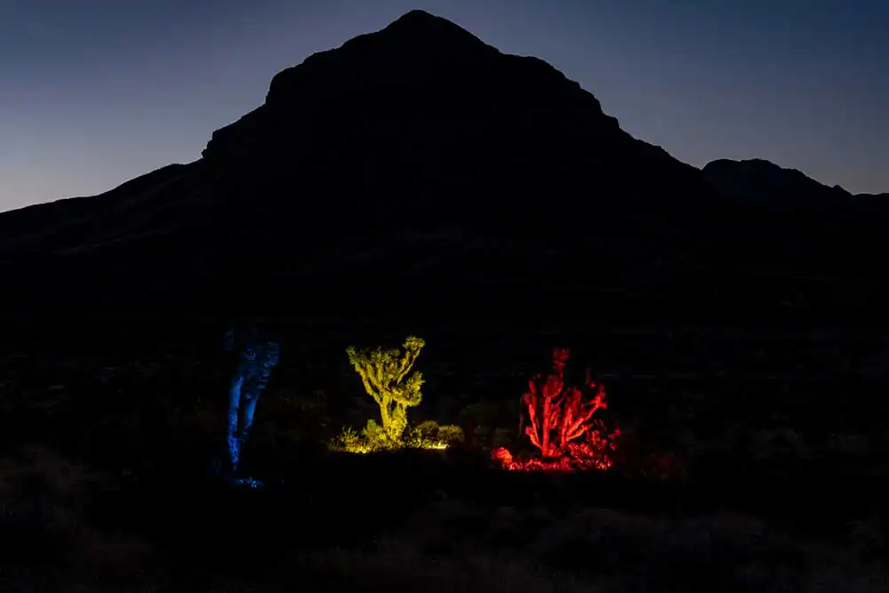 Originally, the project was an extension of his ongoing eight-year endeavor to document the struggles faced by the Joshua tree due to climate change and human intrusion into its natural habitat. However, it took a new direction when the Western Joshua Tree Conservation Act was passed in California, piquing his curiosity about Joshua tree populations residing beyond the protective bounds of this legislation. This led him to explore and photograph the outskirts of the Mojave Desert in Arizona, Utah, and Nevada, where these unique plants exist. Most of the photographs were taken during the scorching summer months of the American Southwest, but he soon realized the allure of capturing the desert at night. This shift became an intriguing venture into the secret world of the nocturnal desert landscape. What appeared lifeless and barren during the daytime manifested a vibrant ecosystem teeming with nocturnal creatures when darkness fell. Initially, as creatures emerged, the sounds of tiny feet scurrying through the desert grass in the disorienting darkness was unsettling. However, armed with portable lights and homemade color filters, he illuminated the Joshua trees, allowing them to assume a commanding presence within their desert surroundings. Each tree seemed to pose for the camera, demanding nothing more than acknowledgment of its unique beauty. Responding to their silent plea, he contemplated the changes these remarkable plants have witnessed over the centuries, their enduring existence witnessed only by the stars above.