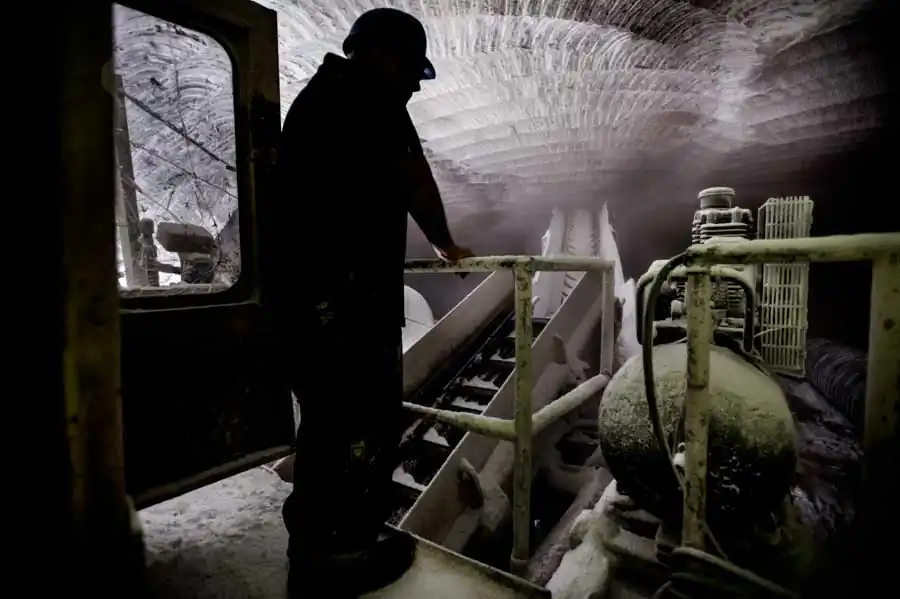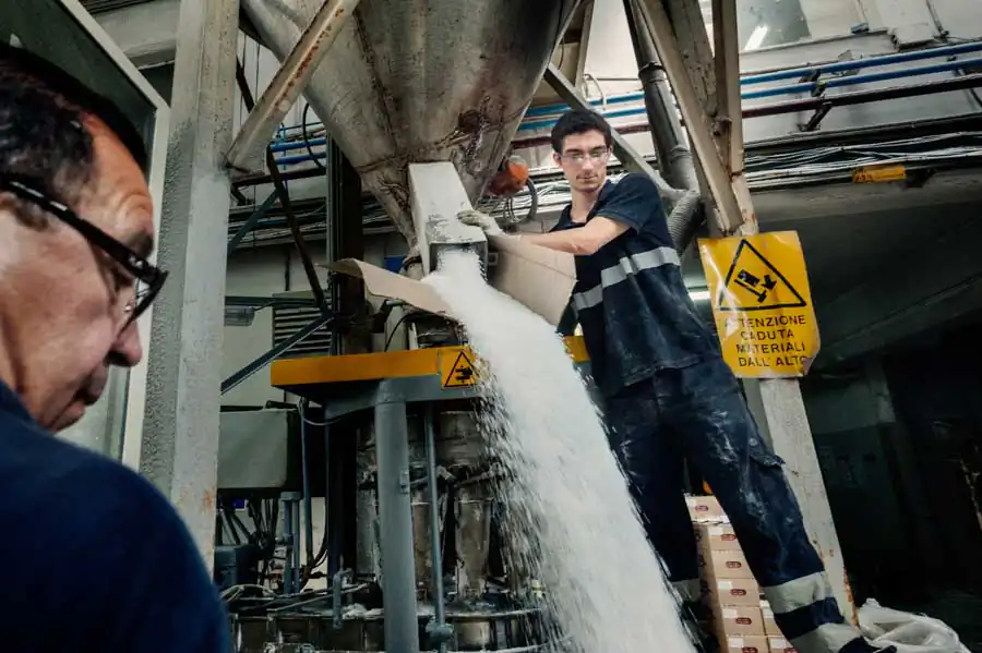 Near to the mine there is the packing plant: two separated production lines, one for human consumption, selected by means of prior testing and protected from any manual contact, and the other one for industrial applications, mainly for animal feed, tanneries and dyeing work industries .