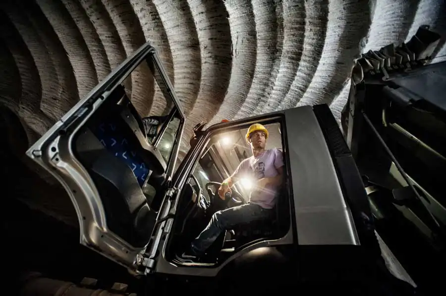 Going down in the mine, leaving behind the light, to enter into the bowels of the earth, where the work of man has created miles of tunnels, which penetrate the mountain for hundreds of meters below the surface. The feeling of claustrophobia immediately turns in astonishment. Galleries are not the narrow passages I expected, but large, enchanting and engaging, with streaks and textures worthy of a baroque cathedral. The mine is like a womb, it is the ‘beginning’, it’s here that there was the sea millions of years ago, when there was still no trace of man. Entering and descending through the network of tunnels is a step back in time. In the mine, time stops, losing track of it, the darkness and the shadows are the guardians of this kingdom which contrast with the white reflections of salt only illuminated by the machines that dig up to 7 meters of tunnel per day. The light. It’s a lunar landscape, where the lights of machinery, completely covered by a white powder, seem
