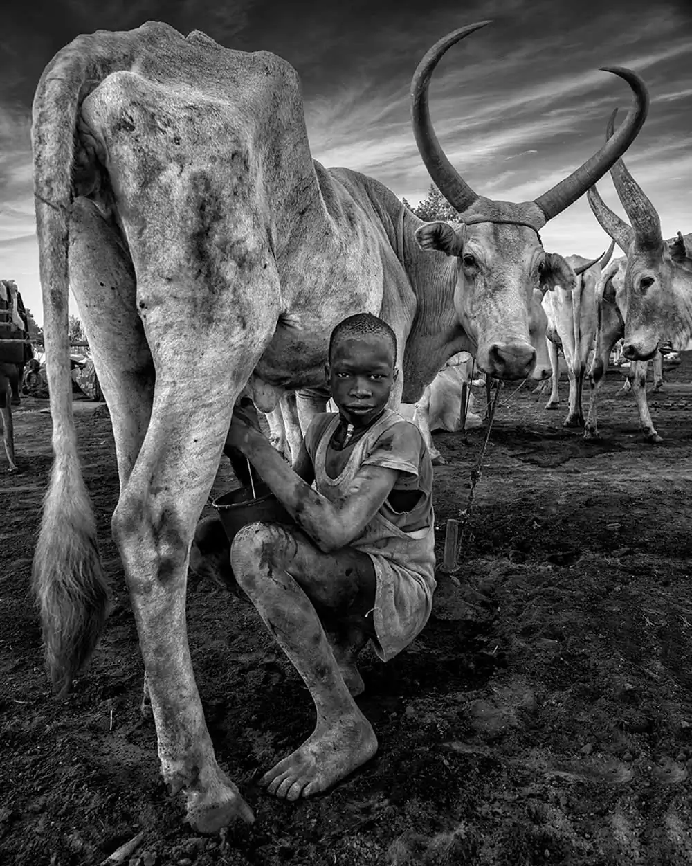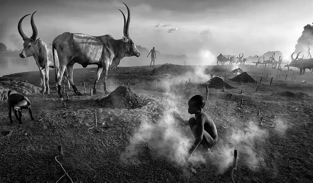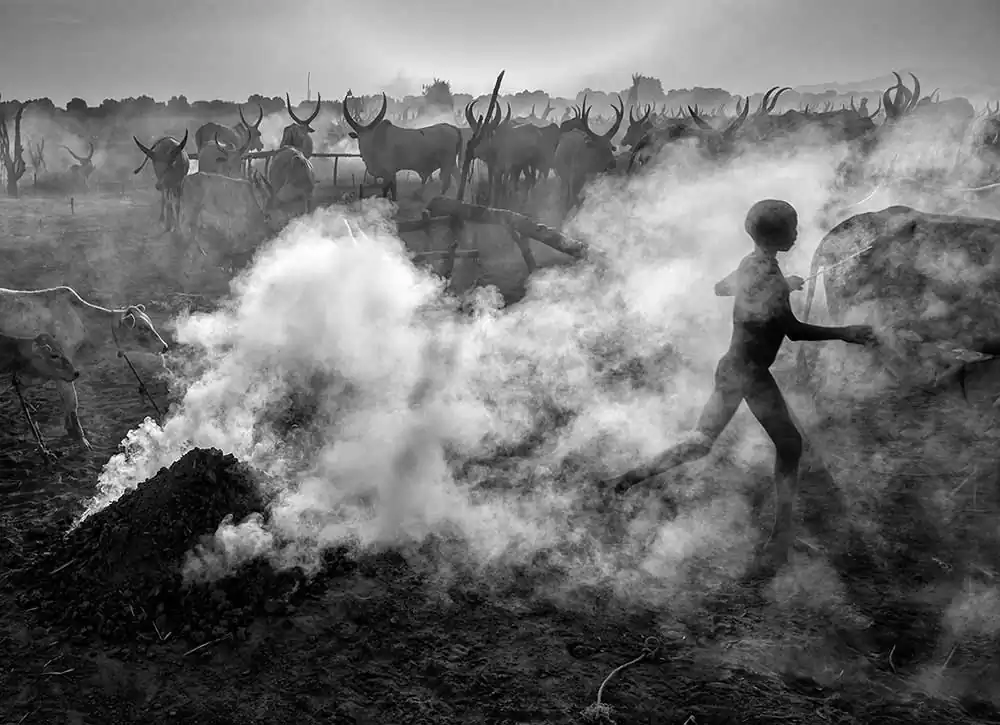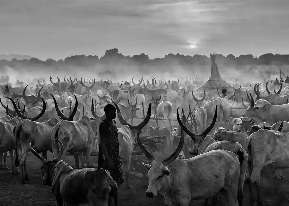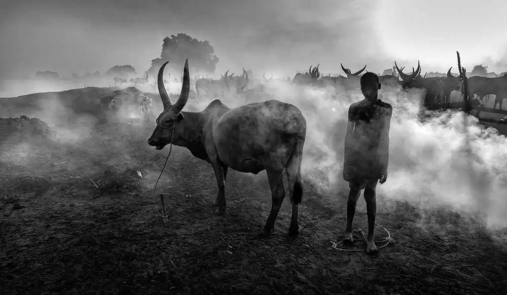 At dusk, hundreds of Ankole cows return to the camp after grazing, called by the sound of drums. They enter the environment of fog, dust and smoke produced by burning manure fires. Each one has its place, tied to a small stake, they gather around the fire and are meticulously massaged with ashes, including their large antlers, as a protection against insects, in a ceremony of total intimacy with the animal. They are sacred intermediary cows of their Gods and on them depends their livelihood, their social position, their dowry to form a family.