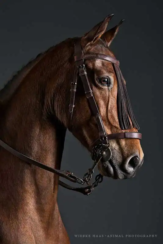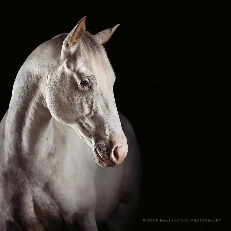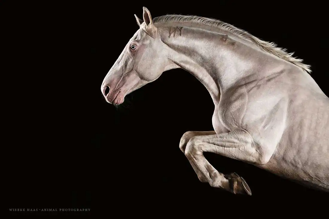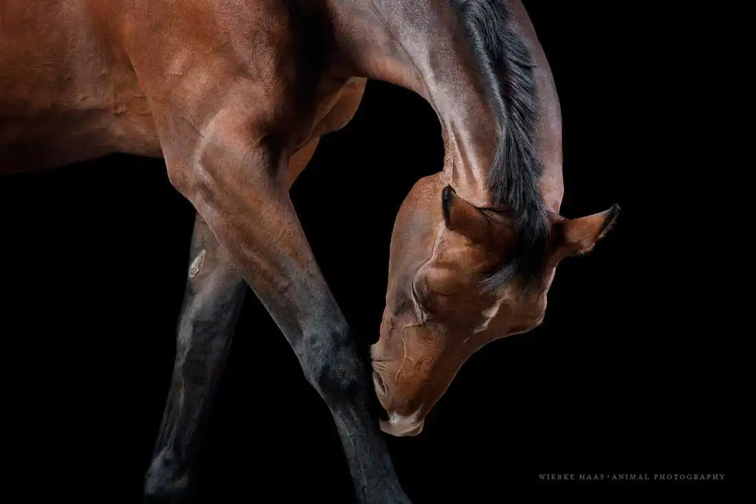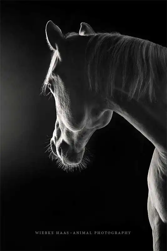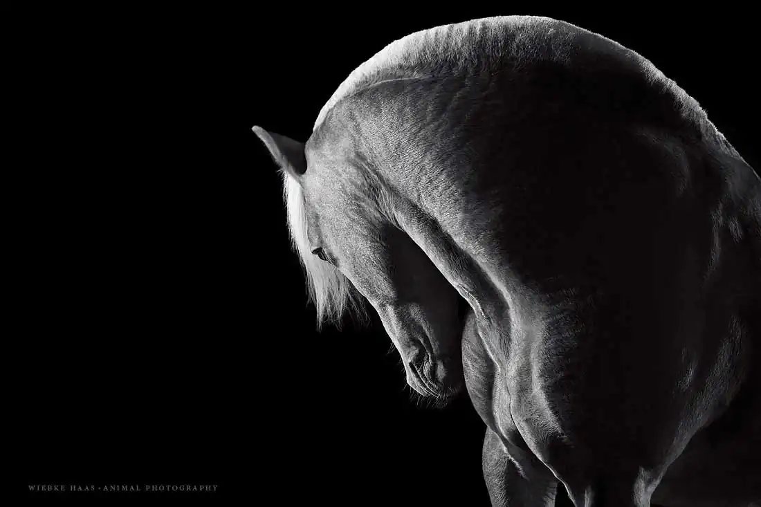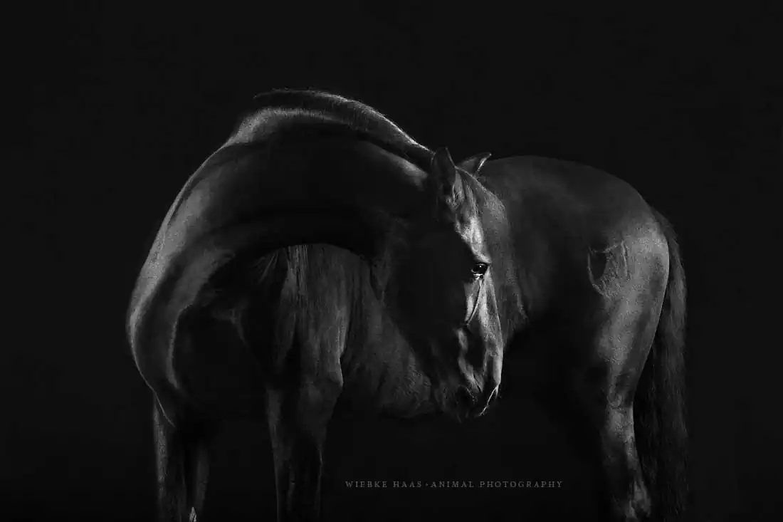 The essence of her photography is the work in studio. Clear structures, the control of lights and the emphasis on the horses themselves supports her intention to make the viewer look at an image over and over again. In studio she likes to photograph with different light formers (soft boxes, strip lights, normal reflectors,…) and multiple light sources to work out the body parts Wiebke wants to emphasize. The more complicated the better.