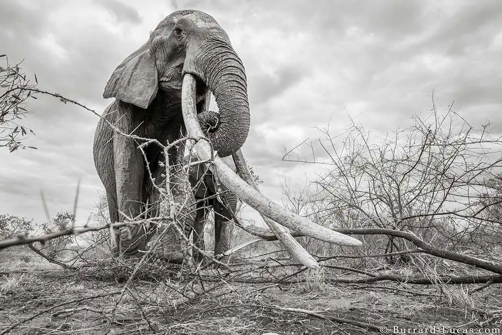 The images show the old elephant drinking at waterholes, eating acacia branches and striding towards the camera. The pictures were taken with BeetleCam – a remote-control camera buggy first developed by Will Burrard-Lucas in 2009 to capture close-up photographs of potentially dangerous African wildlife. The technique provides an intimate and spectacular perspective, showing the elephant’s amazing tusk stretching down towards the camera.