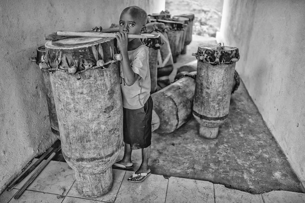 The photographs in this portfolio focus on the schools and the clinic itself. A pre-K is run by VHW, which has also contributed classrooms and funding to an École Fondamentale or “Ecofo,” a public elementary-through-high school. Both are a lifeline for the community. Young children walk miles in plastic sandals and arrive at the pre-K, often hungry and listless, where they are greeted first with music and dance performed daily by the VHW band, and a bit later, by breakfast.