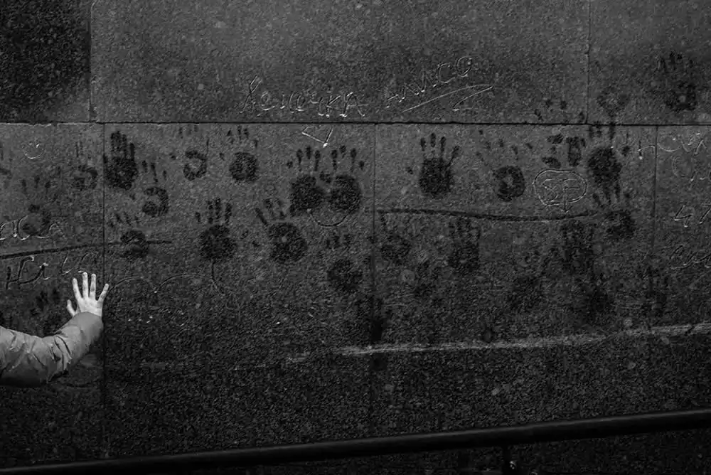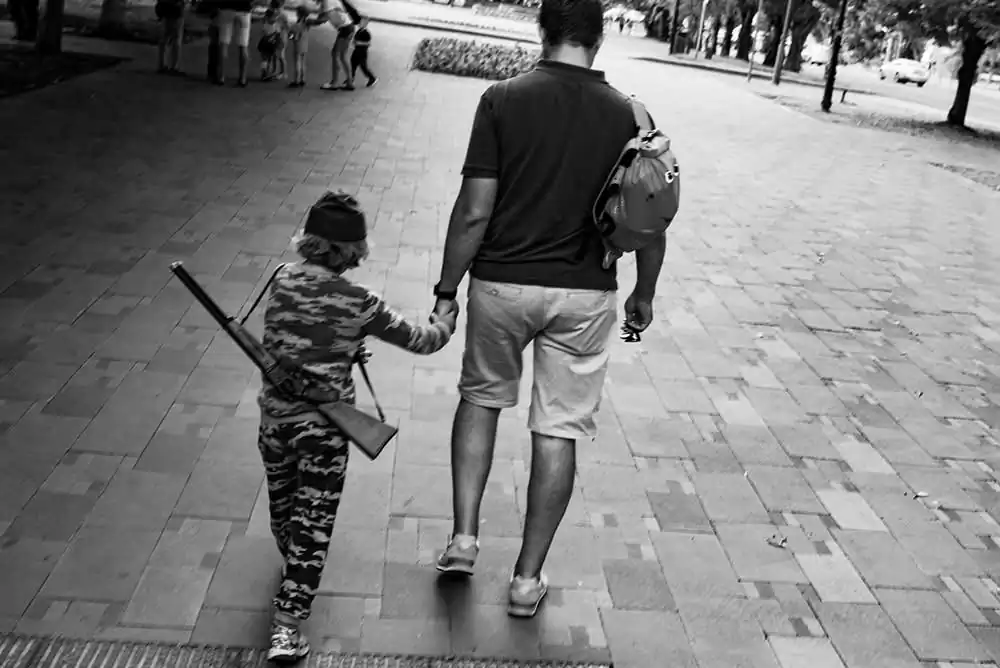 This desire left me long ago, along with my naivety. I didn’t try to make a series about the war or the memory of the war – I just wandered the streets and photographed what I saw, wandered from quarter to quarter, from city to city. But, having sat down to sort out the archives, I suddenly discovered that I had already fixed a lot of war. This war is in every frown face and in every shaved head. In the camouflage kids’ shorts and a plastic gun. In the angry fathers. In a sticky red puddle by the bar, in the lights of a police car that does not let you sleep until five in the morning. In the inked shoulders and fountains, clogged by the drunken soldiers in Airborne Forces Day. In the burnt out streetlights and in the people gazing out of that dark. In all that patriotic propaganda. In the militarism. In the new Armata tanks. In the victory parades, which have been held for 75 years. In the sleeping nukes. On the news feed and in the fear of tomorrow. In the smell of alcohol. In the kitchen knife. In the hand holding the keys as brass knuckles.