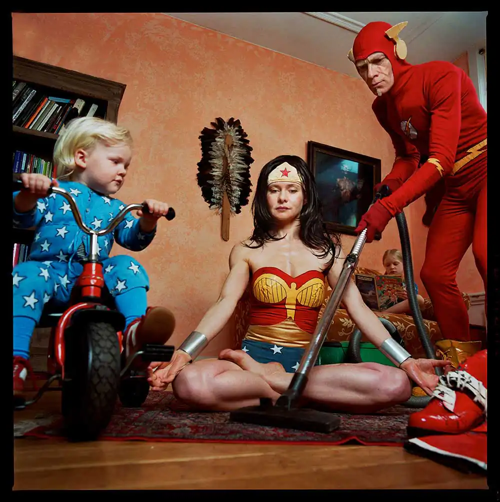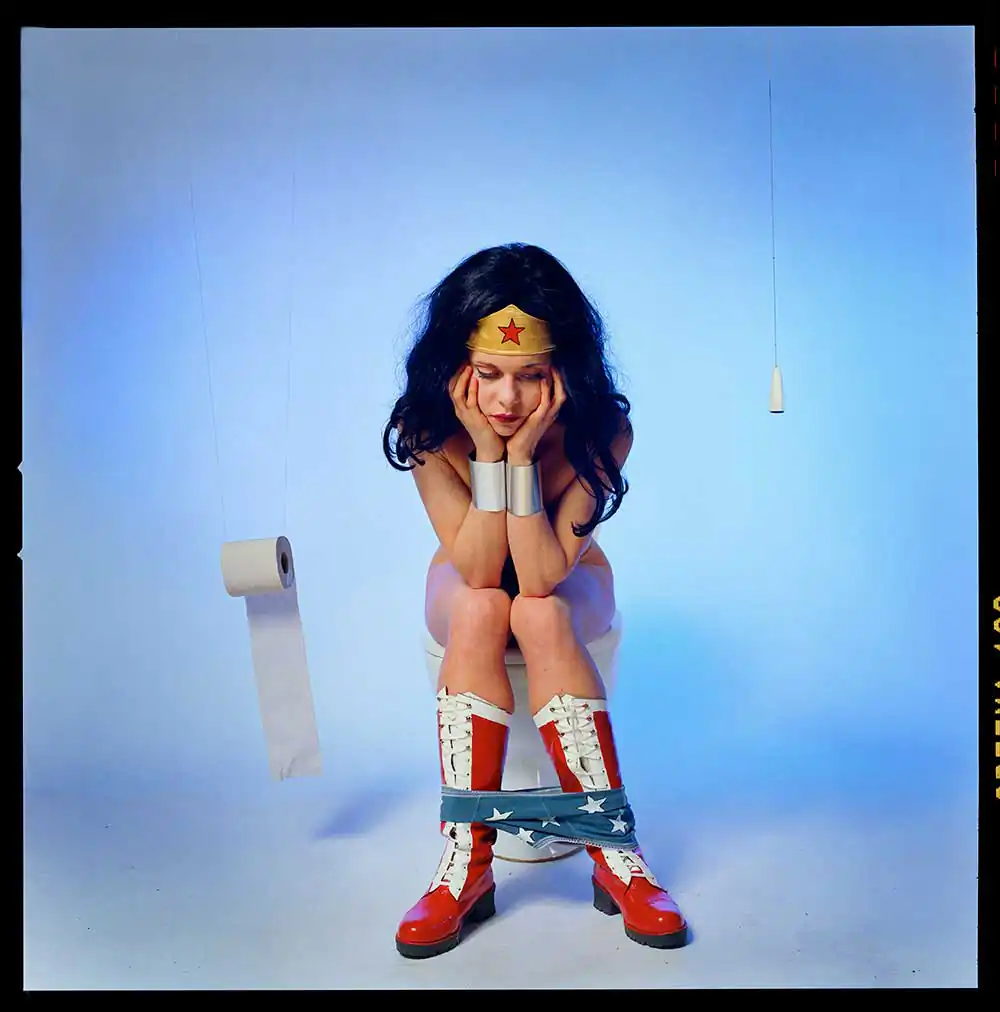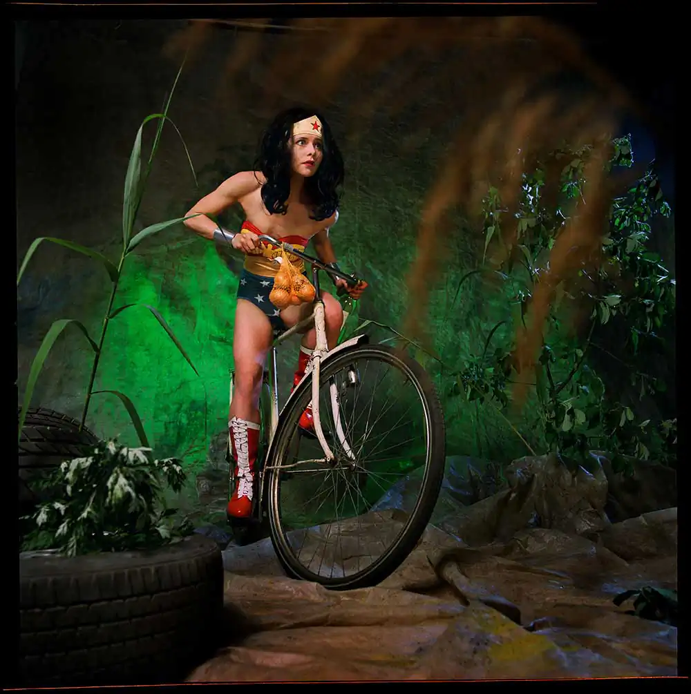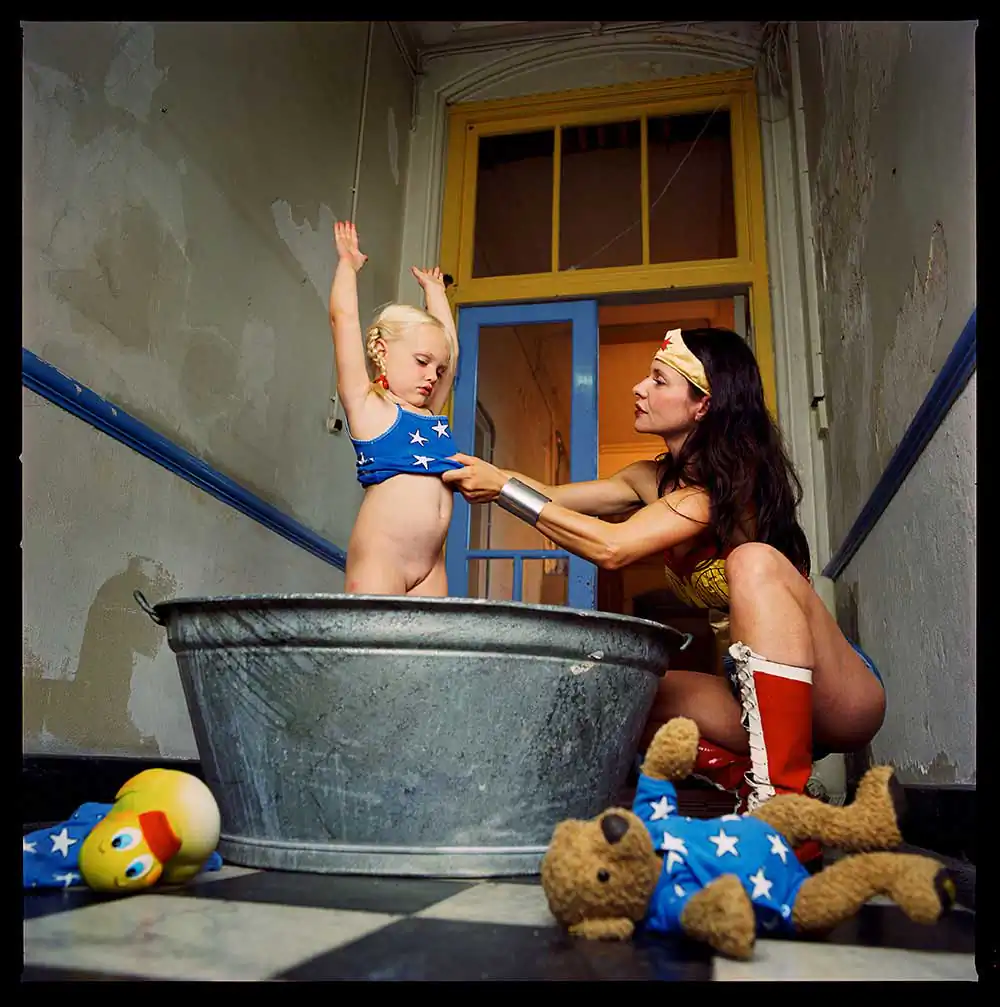 In the Wonder Woman series, I photograph the comic heroine as an anti-heroine. I place her in human situations where you would never find a super-hero, with a slight sense of (self) irony and melancholy. You can see her on the toilet; lonesome in a garret eating a cupcake; crying; as a mother bathing her daughter; anxiously cycling through the forest; cleaning with rubber gloves; full of passion or melancholy; having cravings for pickles during pregnancy; all of this in recognizable or unrecognizable everyday family situations.