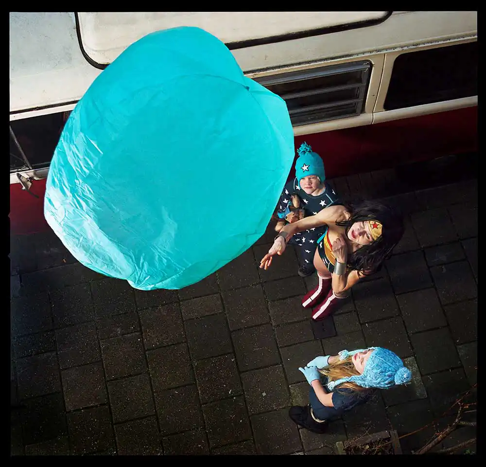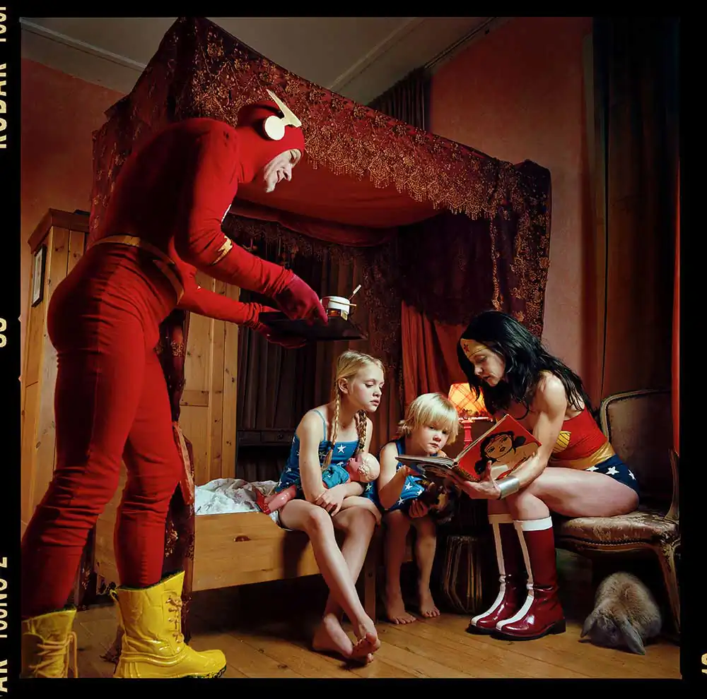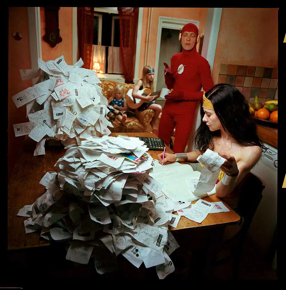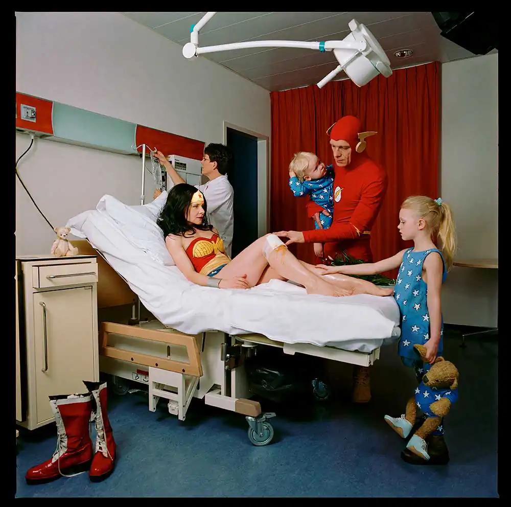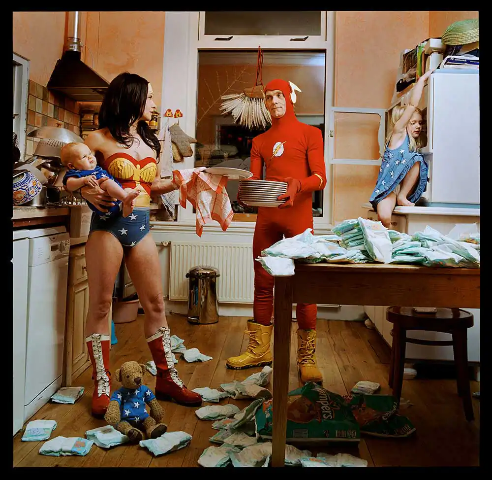 In the Wonder Woman series, I photograph the comic heroine as an anti-heroine. I place her in human situations where you would never find a super-hero, with a slight sense of (self) irony and melancholy. You can see her on the toilet; lonesome in a garret eating a cupcake; crying; as a mother bathing her daughter; anxiously cycling through the forest; cleaning with rubber gloves; full of passion or melancholy; having cravings for pickles during pregnancy; all of this in recognizable or unrecognizable everyday family situations.