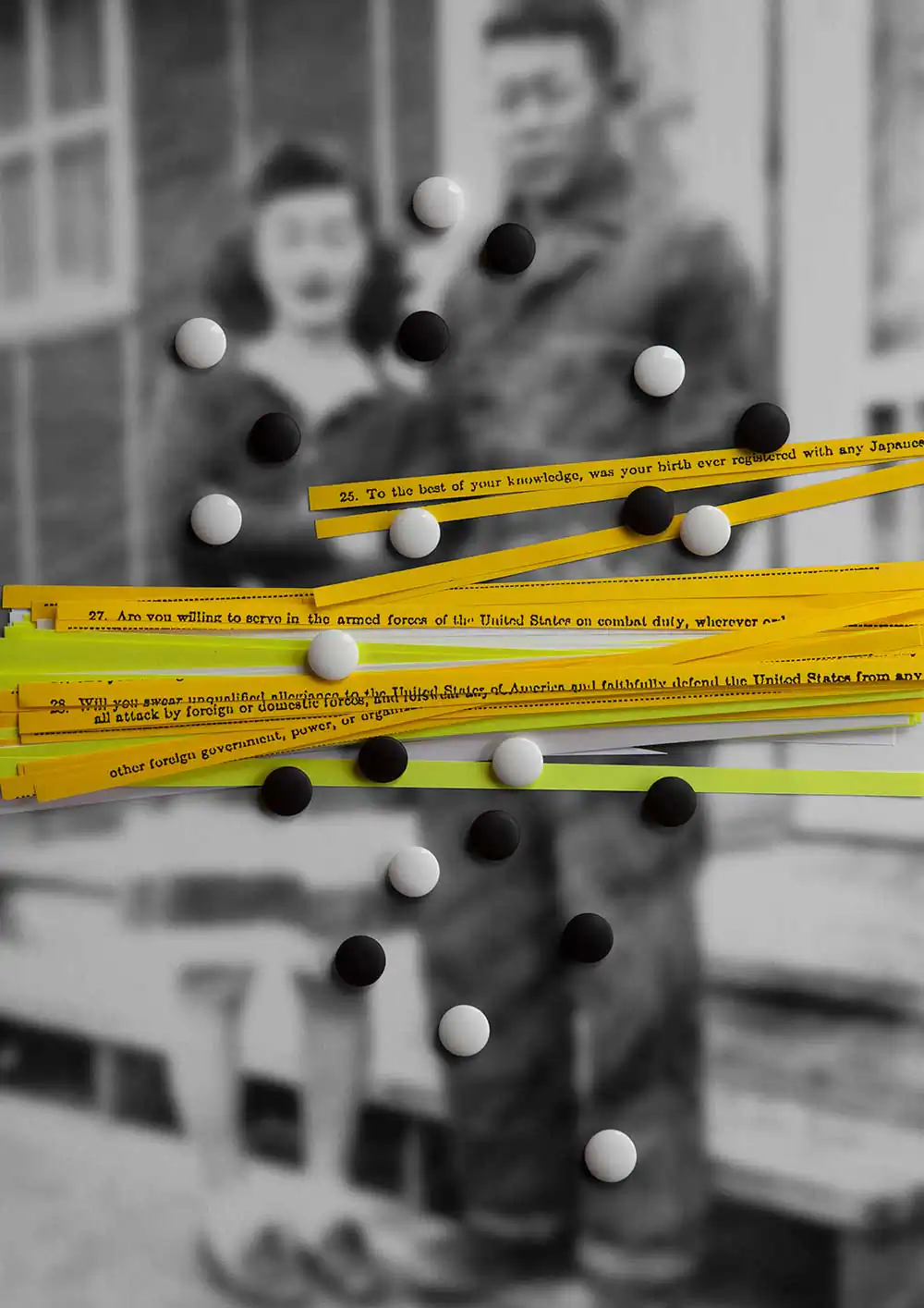 These personal images are an expression of the misjudgments and injustices that result from hysteria, racism, and economic exploitation. As a third-generation Japanese American born after the camps, Takigawa was spared bitterness by the gift of his family’s silence about these injustices. But his family’s silence betrayed the gravity of the legacy he inherited. For the first time, he felt the shame, anger, and fear his family experienced. The title, Balancing Cultures, stems from his struggle to reconcile Japanese and American cultural attributes. Growing up, he was admonished to “be American”—concurrently, Japanese values were instilled. This project is an effort to make this paradox whole as well as give voice to his ancestor’s feelings.