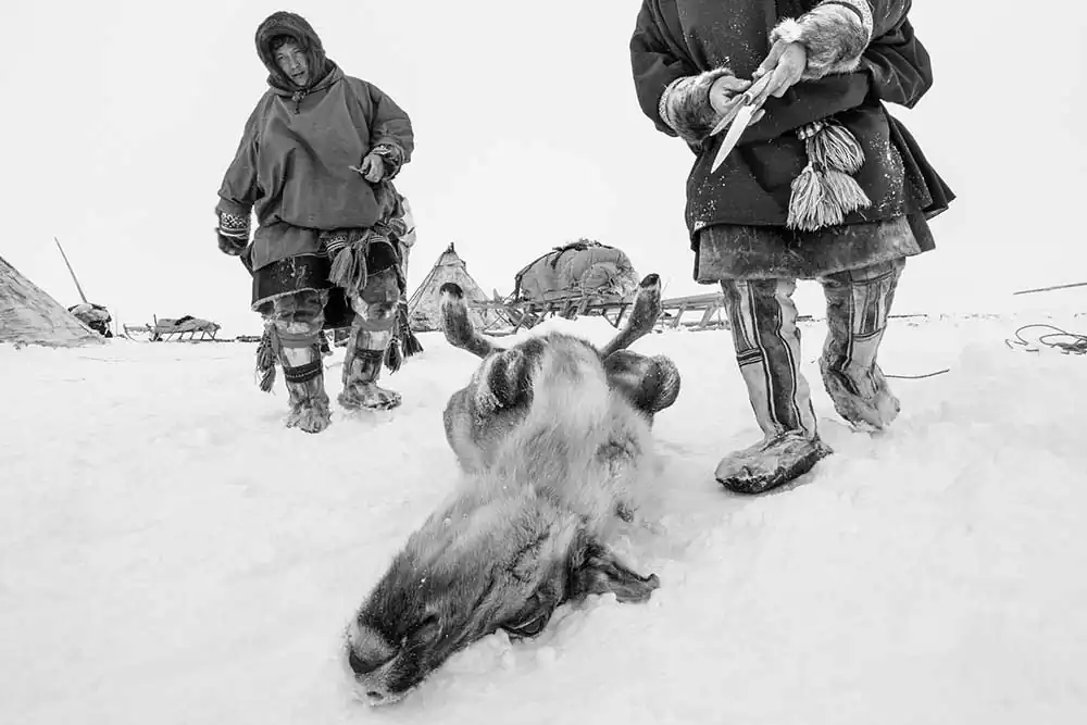 Amazed by this family, who live in perfect harmony with their surroundings in polar conditions. These few days spent with them will change me for ever. I hope they will be able to protect themselves from the relentless attacks of consumerism, pollution and discrimination. And Lida, an elderly Nenets woman, keeps telling me that reindeer is their life and their future.