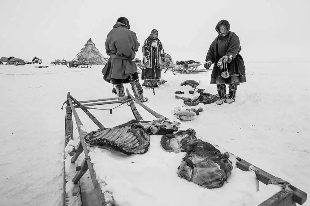The Nenets eat fish such as white salmon and muksun, a silvery-coloured whitefish and gather mountain cranberry during the summer months. Reindeer meat is also the most important part of the Nenets’ diet. It is eaten raw, frozen or boiled, together with the blood of a freshly slaughtered reindeer, which is rich in vitamins. Every Nenets has a sacred reindeer, which must not be harnessed or slaughtered until it is no longer able to walk.
