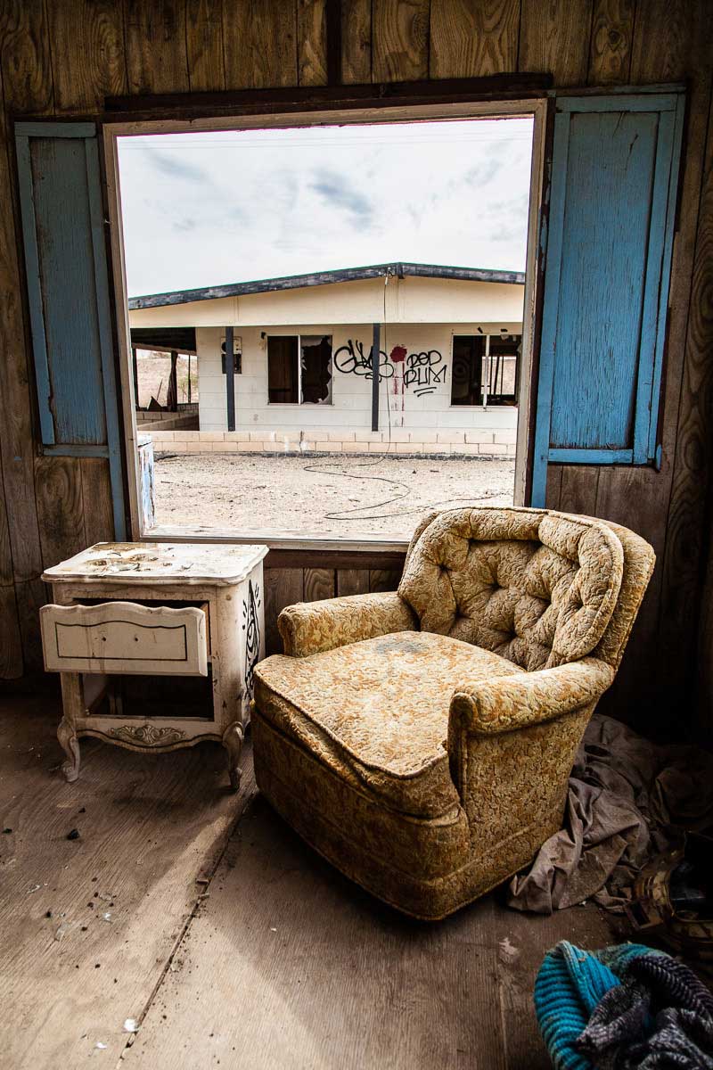 Brought into creation every 400-600 years, the Salton Sea – the largest lake in California- is born of off run river, rainfall and agricultural run off for tens of thousands of years, drying up in between. The current fill in 1905 birthed and extraordinarily, bushwa, upscale resort town through the 1950’s and 60’s where Hollywood celebrities, debutants and sport events flocked. Vintage trailers, speed boats, yacht club and hotels created the Salton Riviera where hot babes in sunscreen and cat eyed sunglasses glamoured. Without any outflow, the saline levels in the water rose to great extent, 25% above ocean water. Fish died by tens and thousands over the years, their botulism killed the birds, the stench of fish carcasses hung in the air. Salton Riviera: Abandoned.
